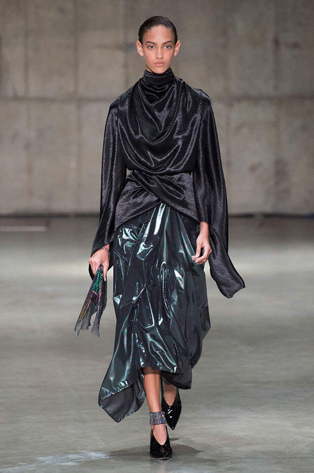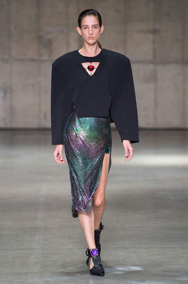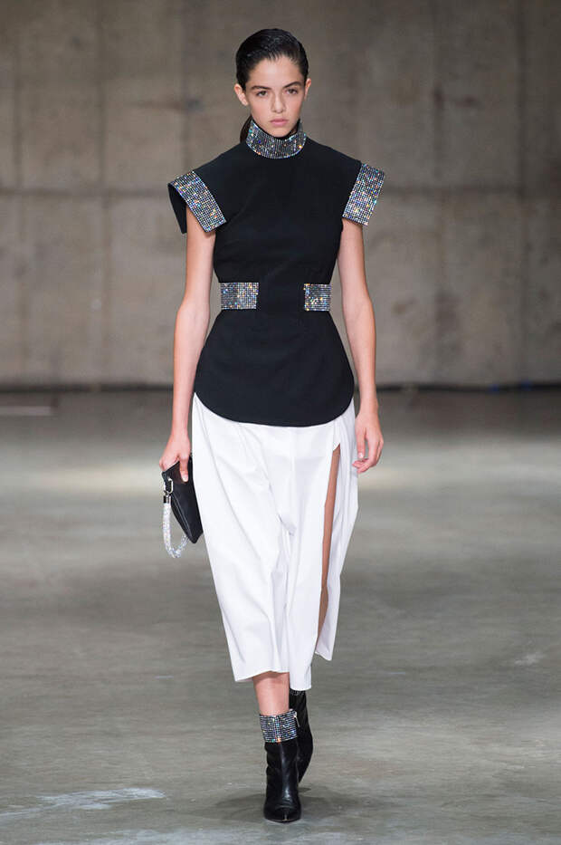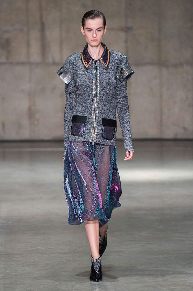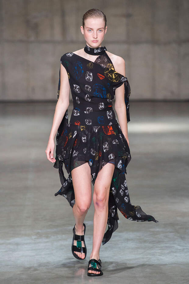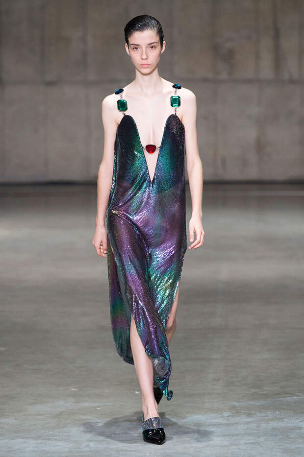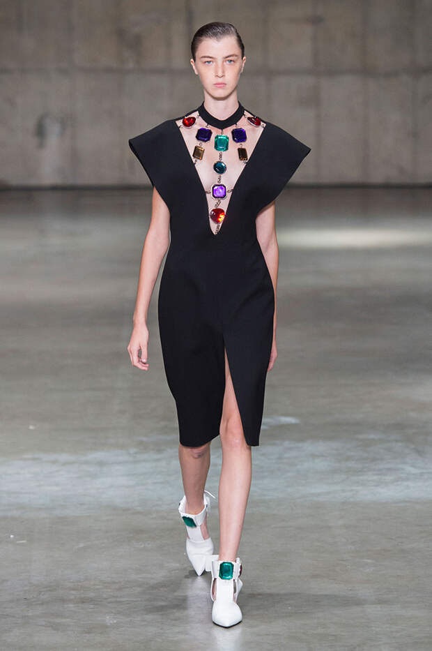 Блок нарядов для вечернего выхода проникнут эстетикой драгоценностей. Кейн использует как реальные камни, так и принты в виде них. Также многие вещи отделаны россыпью страз Swarovski. Для самых смелых в коллекции есть “голые” платья, сшитые из множества прозрачных лоскутов; платья с глубокими декольте и манящими разрезами от бедра. А для тех, кто любит вещи построже, представлены платья прямого кроя и монохромные комплекты из юбок и блуз.