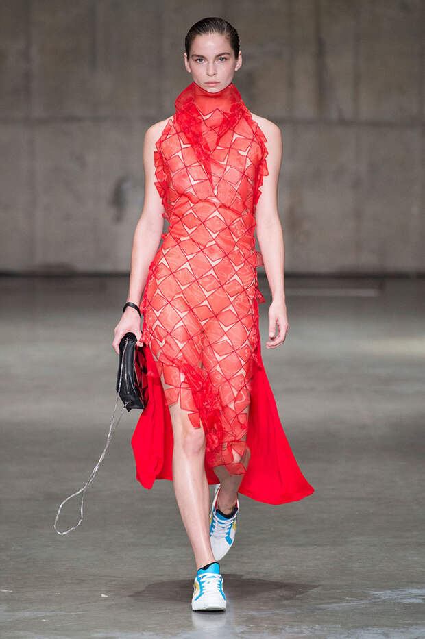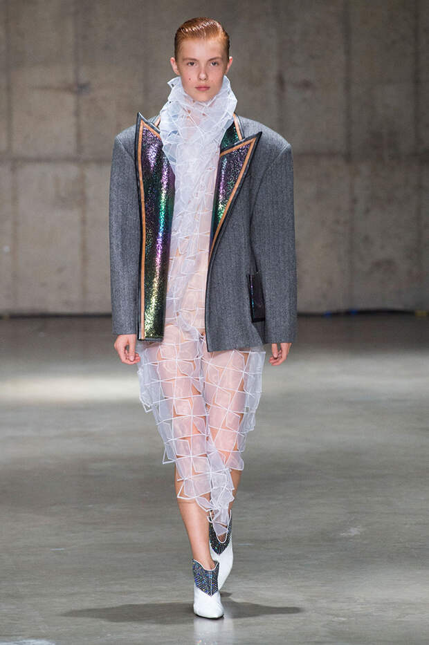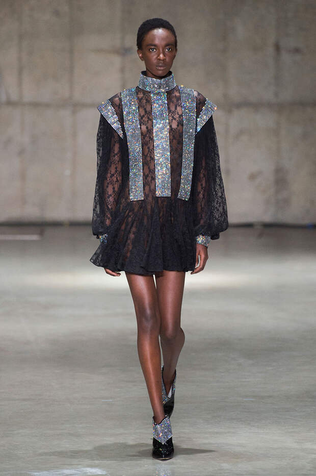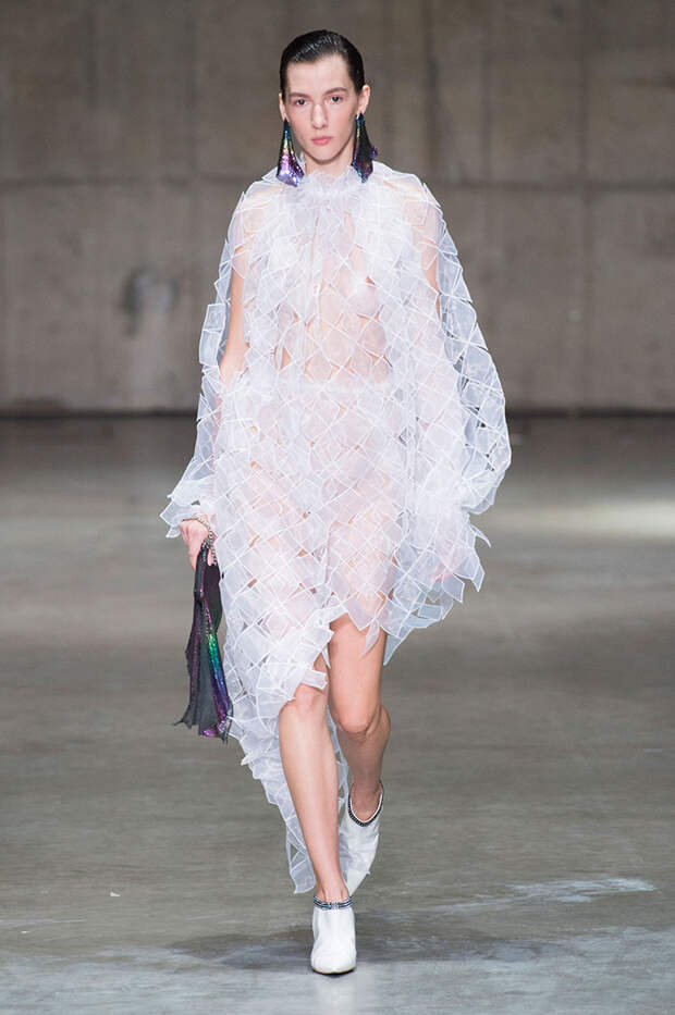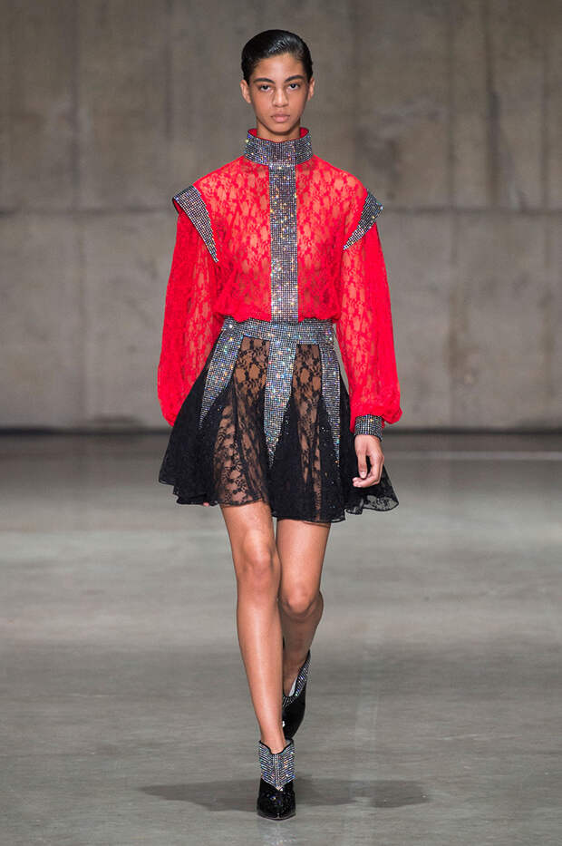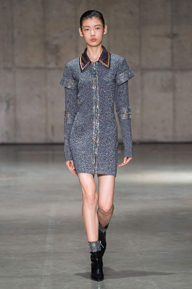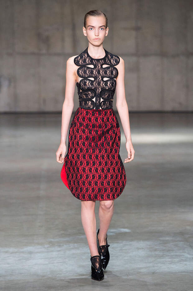 Блок нарядов для вечернего выхода проникнут эстетикой драгоценностей. Кейн использует как реальные камни, так и принты в виде них. Также многие вещи отделаны россыпью страз Swarovski. Для самых смелых в коллекции есть “голые” платья, сшитые из множества прозрачных лоскутов; платья с глубокими декольте и манящими разрезами от бедра. А для тех, кто любит вещи построже, представлены платья прямого кроя и монохромные комплекты из юбок и блуз.