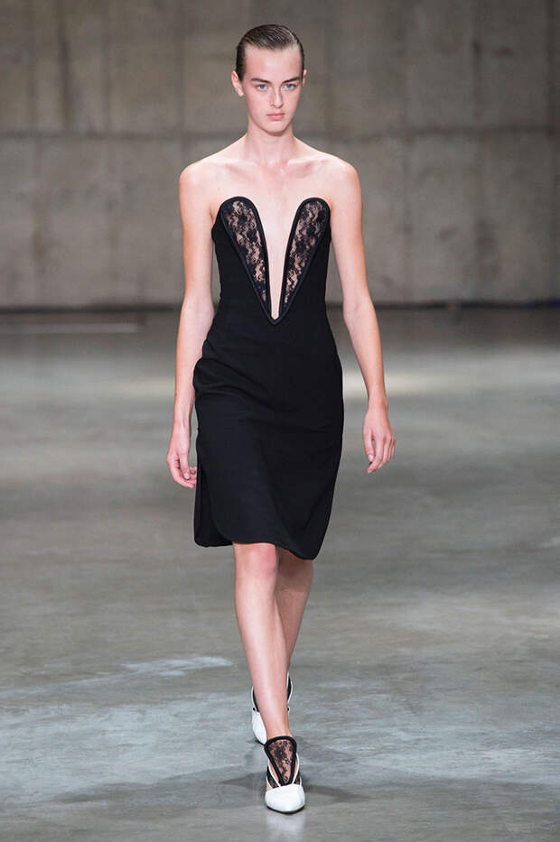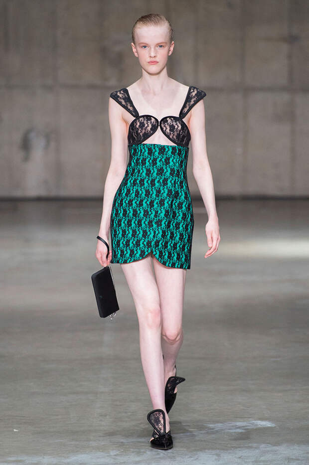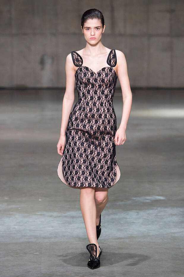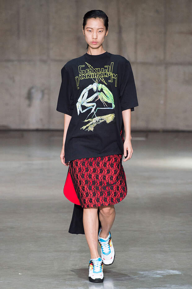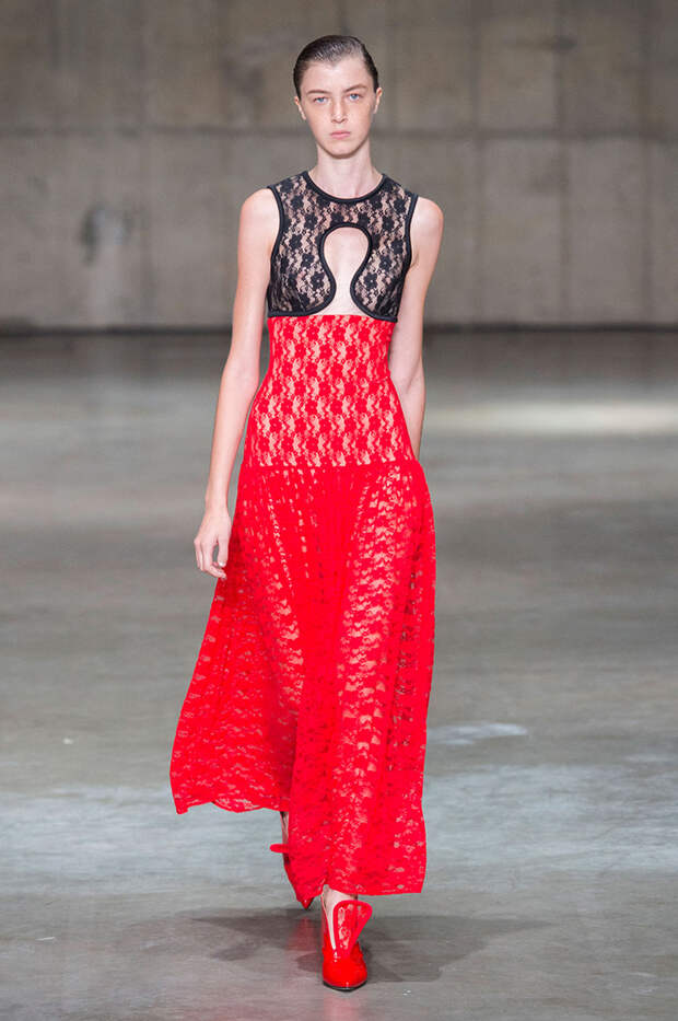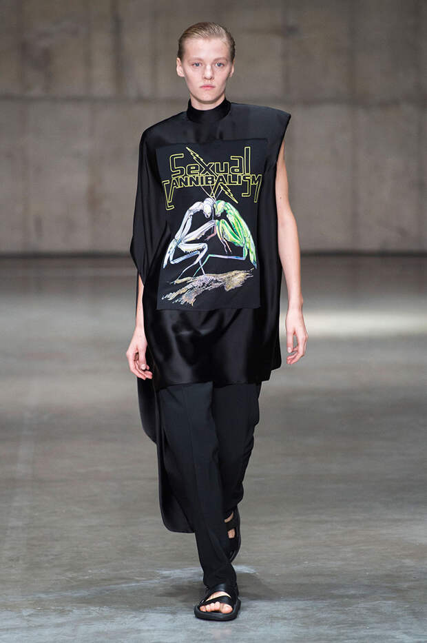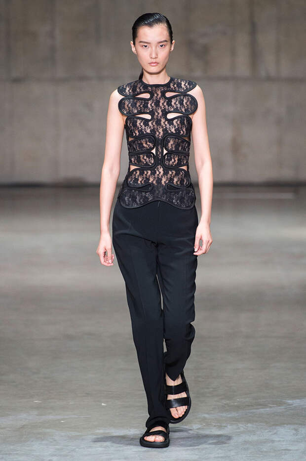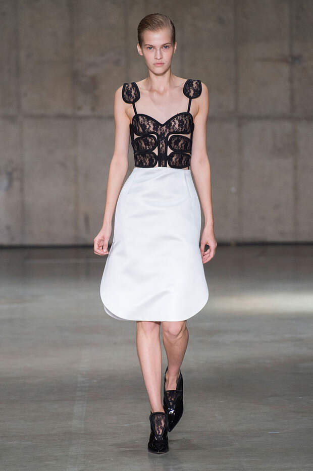 В новой коллекции любимец Британского модного совета и Донателлы Версаче Кристофер Кейн играет с формами и силуэтами, но при этом не ударяется в крайности: все вещи, которые он предлагает носить в весенне-летнем сезоне, получились носибельными и, как всегда, очень женственными. На этот раз подчеркивать сексуальность дизайнер предлагает короткими платьями-бюстье из денима и кружева, юбками плиссе и нежными комбинациями, а если хочется добавить немного дерзости, то здесь подойдут лаковые плащи, “мужские” брючные костюмы и просторные футболки, будто позаимствованные у старшего брата, надписи на которых говорят сами за себя: если в прошлый раз Кейну послужили принтами картинки из книги Алекса Комфорта "Радость секса", то теперь мы видим фразу “Сексуальный каннибализм”.