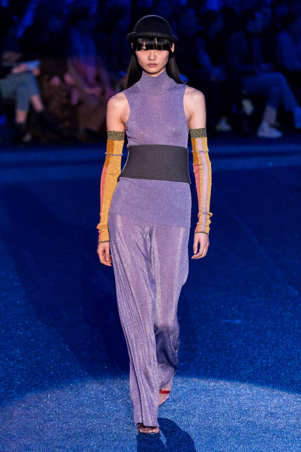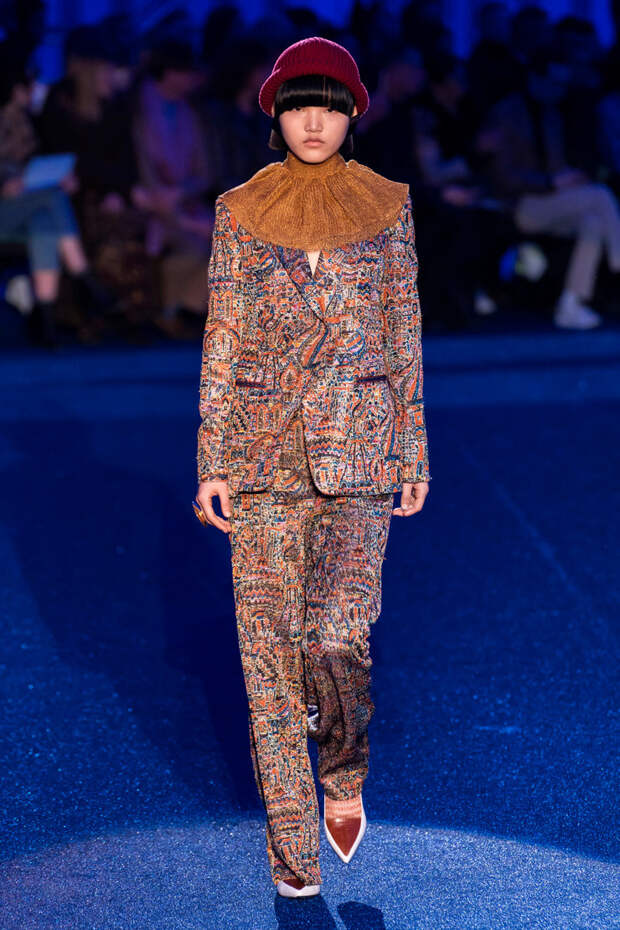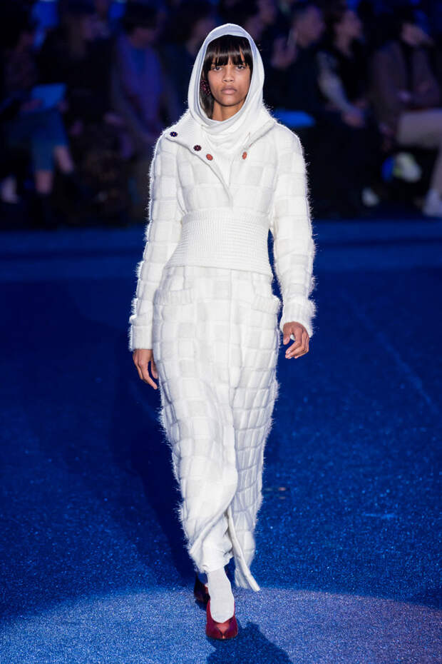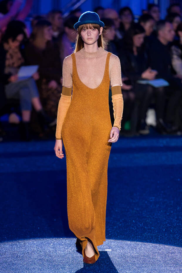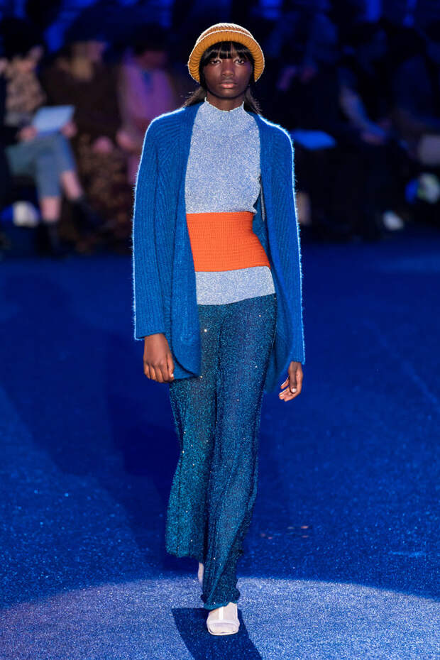 Специально для особенно мерзнущих в коллекции есть мягкие, ложащиеся складками капюшоны, а для тех, кто даже зимой остается модницей — смешные вязаные шляпки. Отдельная история — трикотаж с глиттером: мерцающие золотом легинсы, сияющие лиловые комбинезоны, русалочьи переливающиеся платья.