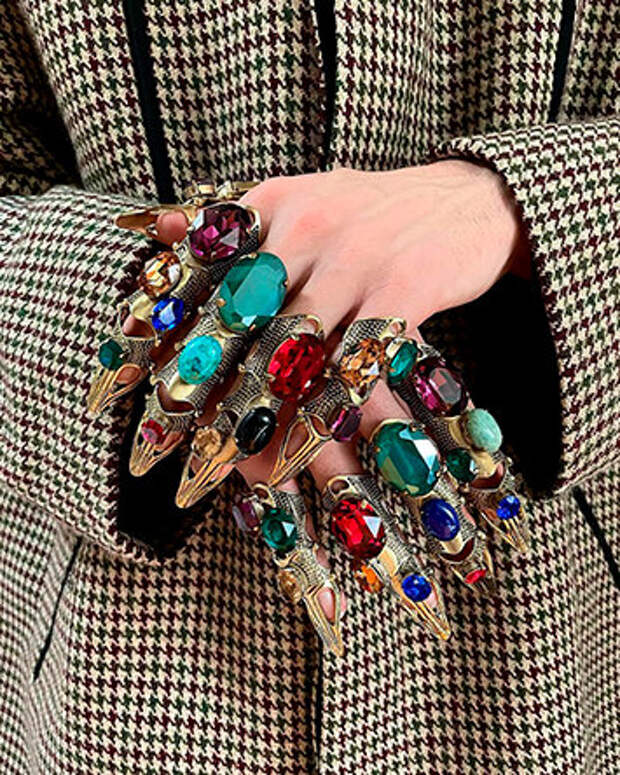 В этом сезоне мы наблюдаем интересную трансформацию колец: нам предлагают массивные украшения на ногти, имитирующие самый смелый нейл-дизайн. Это могут быть золотые «наперстки» на один-два пальца (или всю кисть) с миниатюрными фигурками на концах длинных ногтей — их ищем вновь у Schiaparelli.
