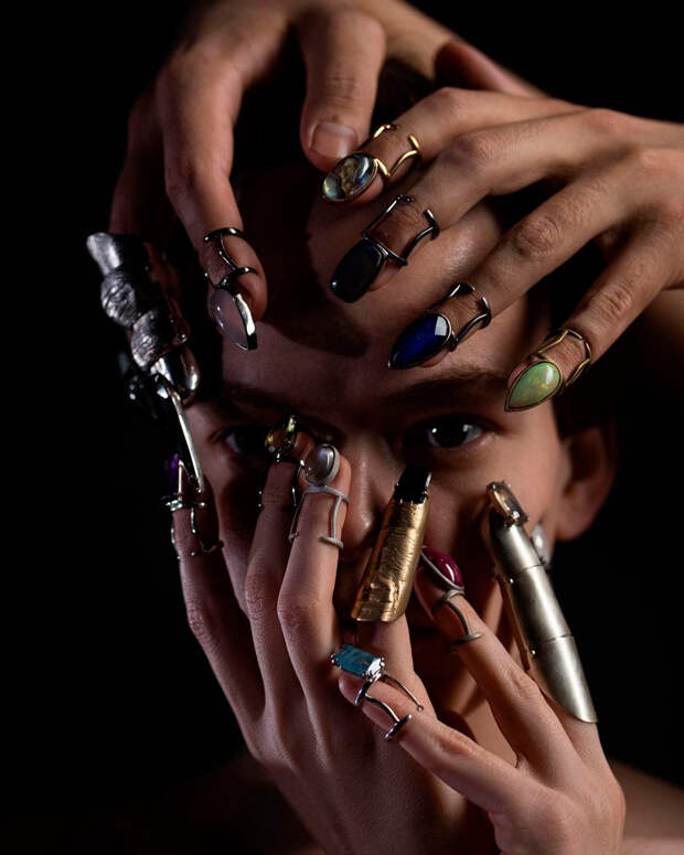 Однако у Дэниэла Розберри это дань сюррелизму и культовой коллекции Эльзы Скиапарелли и Сальвадора Дали, а вот у дизайнерского дуэта Egon Lab — уже ода внутренней свободе. Украшения Egon Lab гармонично вписываются в нарратив бренда, создающего агендерные (хотя номинально мужские) вещи. Драгоценные доспехи с кристаллами Swarovski напоминают о тех временах, когда воинственная маскулинность выражала себя через показное излишество. К счастью, сегодня самоутвердиться гораздо проще не за счет условных "трофеев", а посредством хорошего вкуса и самоиронии — а с этим у Egon Lab все в порядке. Нельзя и не испытать гордость, видя, что идентичные украшения уже давно являются визитной карточкой российского бренда intointo (об из кастетах с «зубами» из опала мы рассказывали здесь).