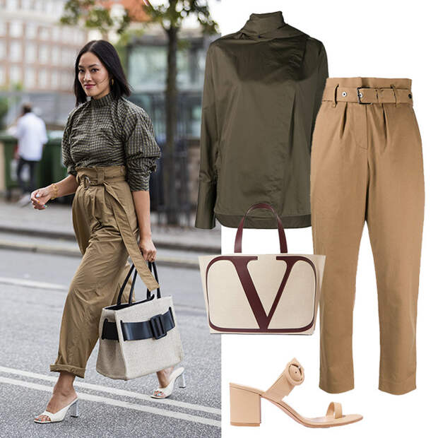 Блузка EUDON CHOI, 27 106 руб.; брюки BRUNELLO CUCINELLI, 79 200 руб.; сумка VALENTINO, 60 371 руб.; сандалии GIANVITO ROSSI, 30 691 руб.