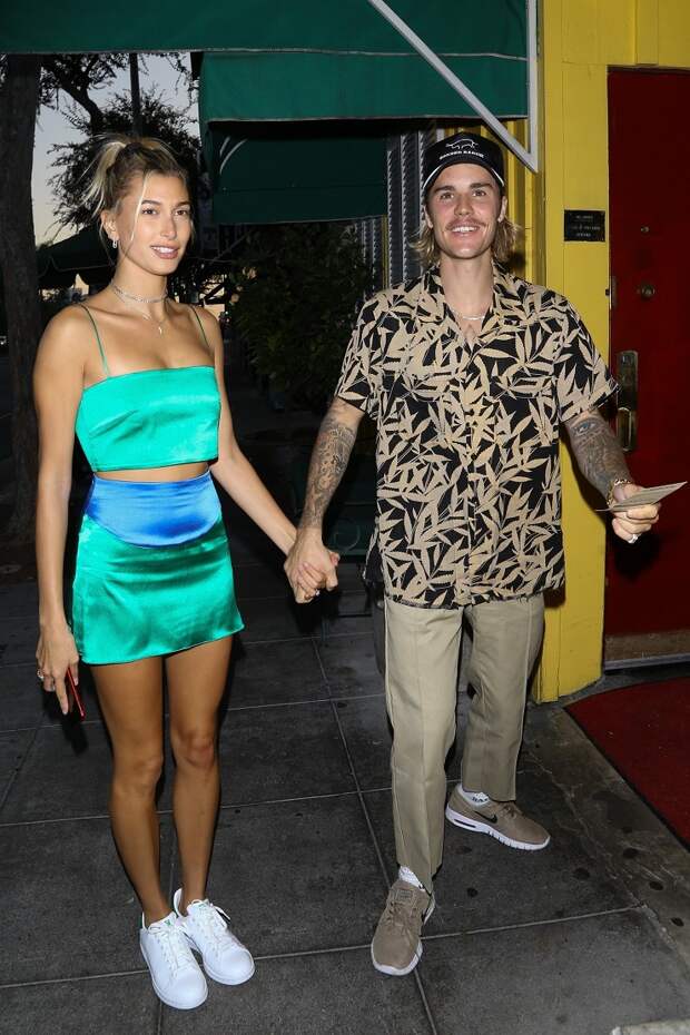 Джастин был одет в укороченные прямые брюки цвета хаки, кроссовки в тон и рубашку с черным принтом. Хейли предпочла для выхода атласный костюм из топа на тонких бретелях и короткой двухцветной юбки - сверху синей, снизу - изумрудно-зеленой.Пара пребывала в отличном расположении духа, что не может не радовать, ведь в последнее время знаменитого исполнителя регулярно заставали в слезах. И тот факт, что теперь у него наконец-то хорошее настроение, не может не радовать.