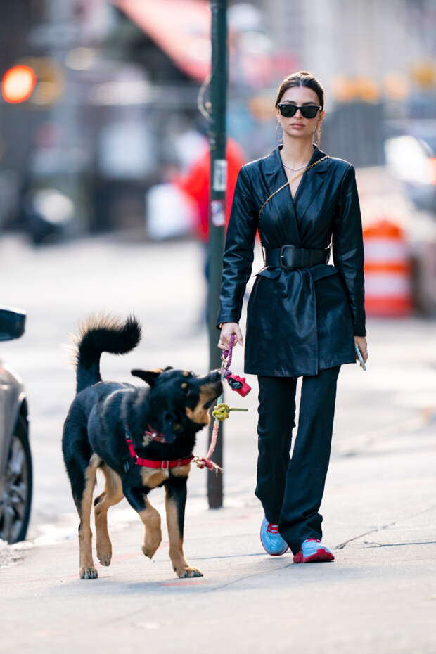 Если дело касается повседневных выходов Ратаковски старается сочетать стиль и комфорт, поэтому пиджак она сопроводила темными спортивными брюками-клеш. Финальным штрихом стали яркие кроссовки — благодаря им монохромный образ получился нескучным.
