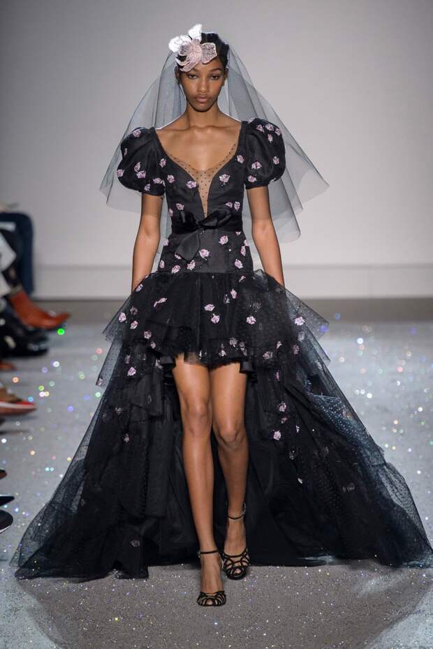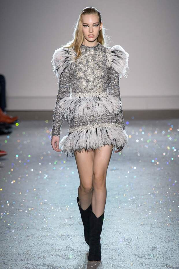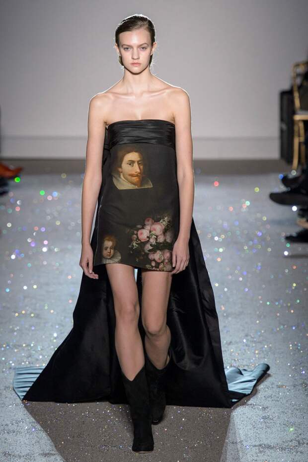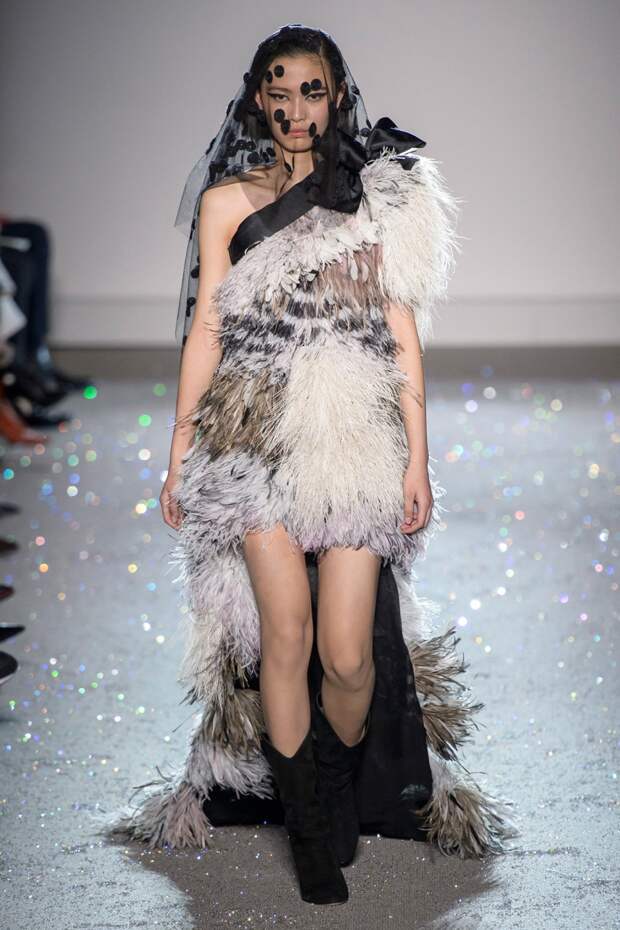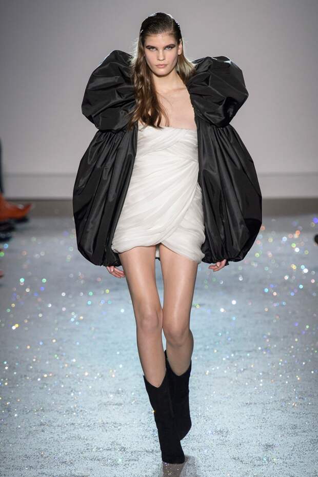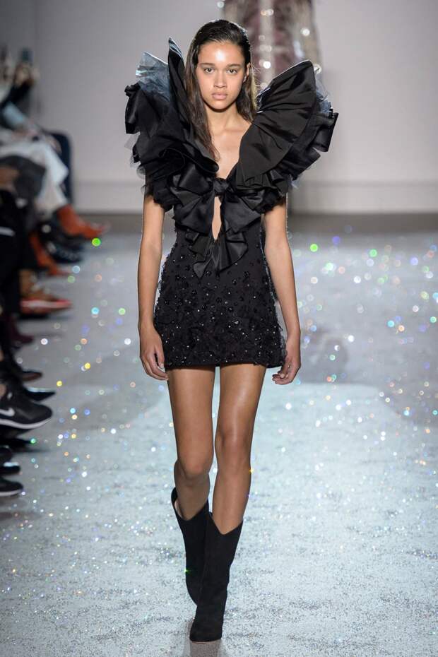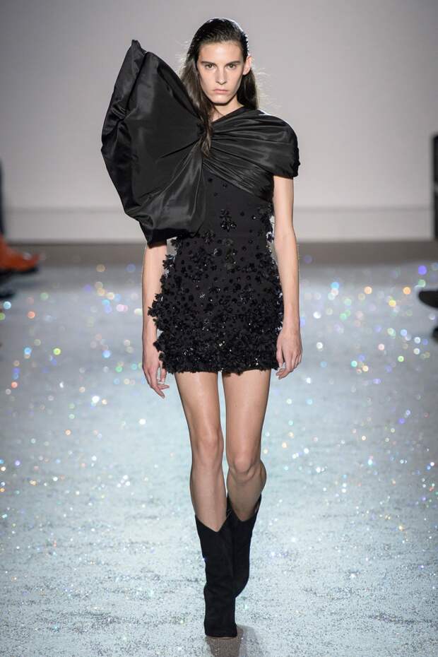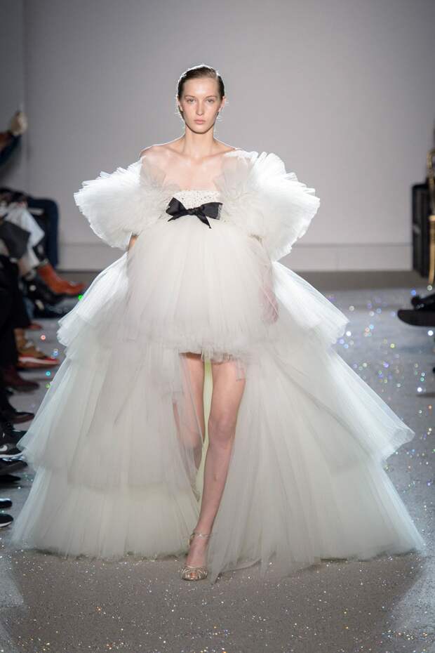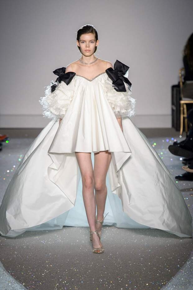 Не обошлось и без традиционных для кутюрье гипертрофированных, объемных и воздушных силуэтов: платья-облака со шлейфом, гигантские банты, невесомые рукава-паруса, бархатные кроп-топы с ручной вышивкой и страусиными перьями — в таких образах легко почувствовать себя героиней сказки — конечно, со счастливым финалом.