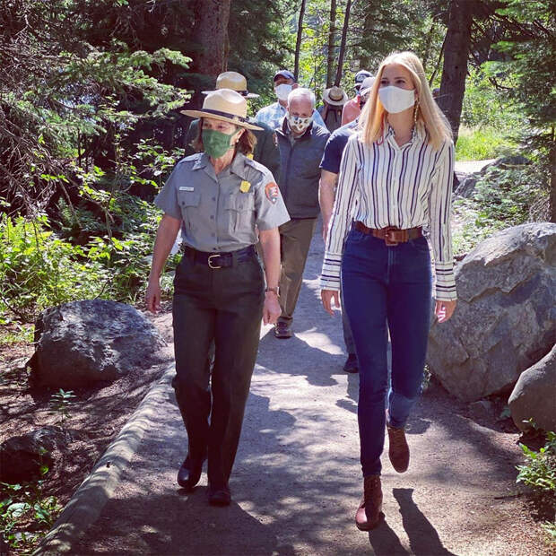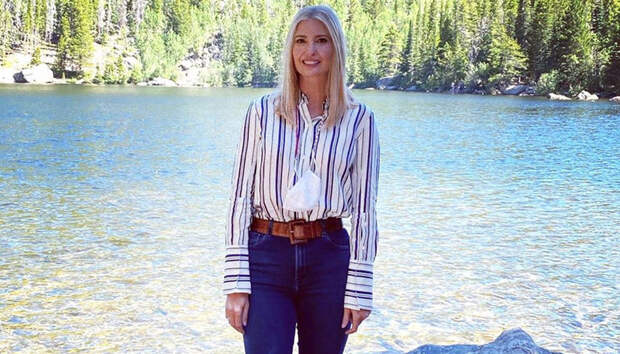 Но для визита в национальный парк Роки-Маунтин наша героиня выбрала полосатую сорочку и джинсы в классическом оттенке navy blue. Именно брюки оказались неудачным решением: по фото заметно, что они малы Иванке и слишком сильно облегают и полнят ее бедра. Ситуацию спас бы расклешенный низ, но формат скинни визуально еще сильнее увеличил объем бедер. Правда, дочь президента не разделяет наш взгляд на свои джинсы и задорно улыбается на фоне живописного пейзажа.