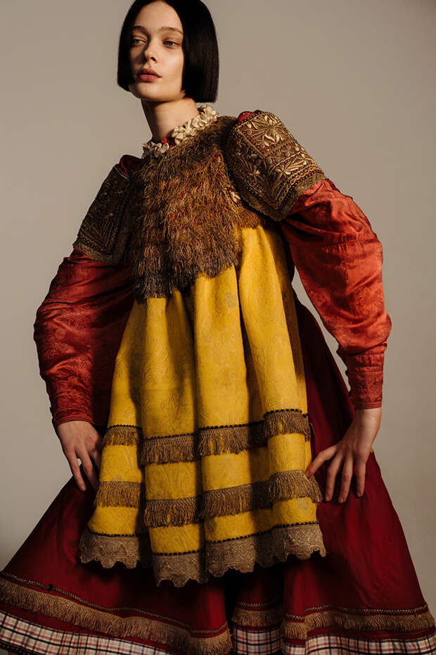 – Прим. HB), да и последняя high jewellery полна брошей-орденов и ожерелий-кокошников. Хорошо помню показанный в Ла Скала кутюр Dolce & Gabbana c отсылками к Юсупову, парадным мундирам и гусарским доломанам. Моя же личная любовь к сарафанам и всему прочему началась с альбома фотографий костюмированного бала, который состоялся в 1903 году в Зимнем дворце, – этот двухтомник я даже потом подарила Доменико Дольче. Меня поразило, с какой роскошью были обыграны допетровские вещи, и я загорелась идеей сделать костюм для себя. За его изготовление отвечала мастерская Большого театра, а невероятная Надя Васильева (художник по костюмам большин- ства фильмов Алексея Балабанова) придумала кокошник с двуглавыми орлами. Теперь у меня кокошников много. Есть простые – черный, белый, серый – на каждый день, а есть и уникальные: например, еще ни разу не видевший свет кокошник из роз работы той же Васильевой, ждет своего часа и шитый жемчугом Dolce & Gabbana.