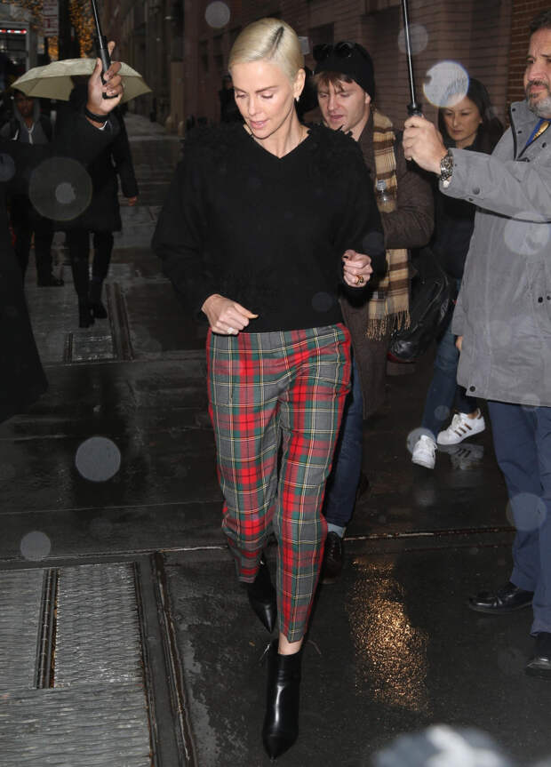 Шотландская клетка или тартан — принт, благодаря которому невозможно остаться без внимания. Каждая уважающая себя модница ловко сочетает вещи такой расцветки с остальными деталями гардероба, получая стильный лук. Шарлиз Терон, к примеру, отлично справилась с поставленной задачей: укороченные классические брюки в шотландскую клетку она надела с простым черным свитером, получив ультрамодный образ.