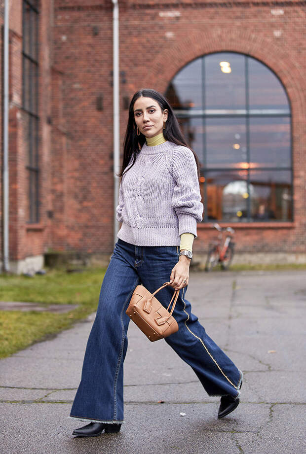 Нельзя не сказать о самом главном – синем. Классический вариант сочетания голубых джинсов с лавандовым свитером - всегда хорошая идея. Сделать образ ярче помогут грубые казаки или разноцветный пуховик.