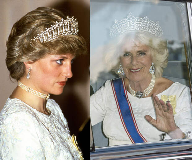 Принцесса Диана — известный трендсеттер в ювелирной моде. Все украшения, которые она носила, моментально становились культовыми, а ее фирменные стилистические приемы поражали разнообразием и оригинальностью. Многие пытались носить ювелирные изделия, как леди Ди — но не у всех выходило. Судя по всему, Камилла Паркер-Боулз тоже вдохновлялась архивными кадрами Дианы в ее украшениях — и тоже решила смиксовать роскошную тиару с жемчужным чокером. Да еще и дополнила такое комбо белым жакетом, чем еще больше усилила сходство.