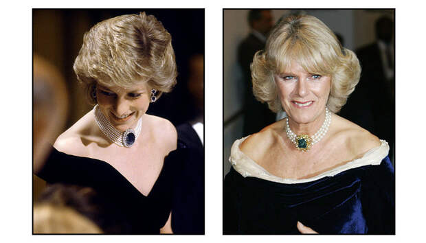 Жемчужный чокер с сапфиром — пожалуй, самое известное украшение в ювелирной коллекции леди Ди. Она очень любила его и носила на многие мероприятия, где каждый раз производила на публику неизгладимое впечатление. Повторить тот же эффект попробовала и ее вечная соперница — и надела похожее колье (но уже с изумрудом) с бархатным платьем со спущенной линией плеча. Все бы ничего, но от зоркого глаза фанатов принцессы Уэльской снова не укрылся тот факт, что весьма похожий образ когда-то был и у Дианы.