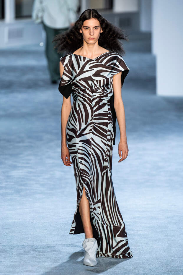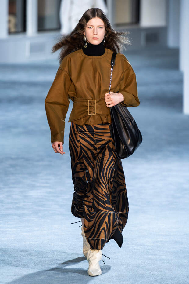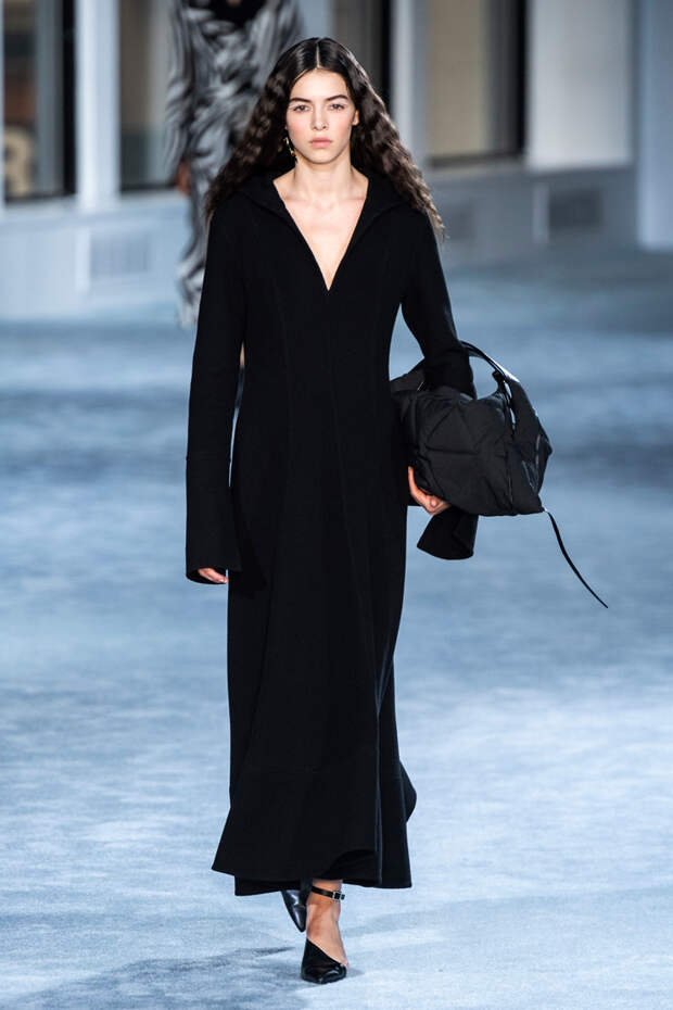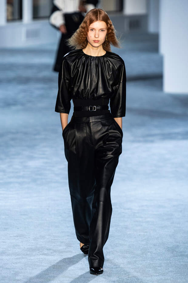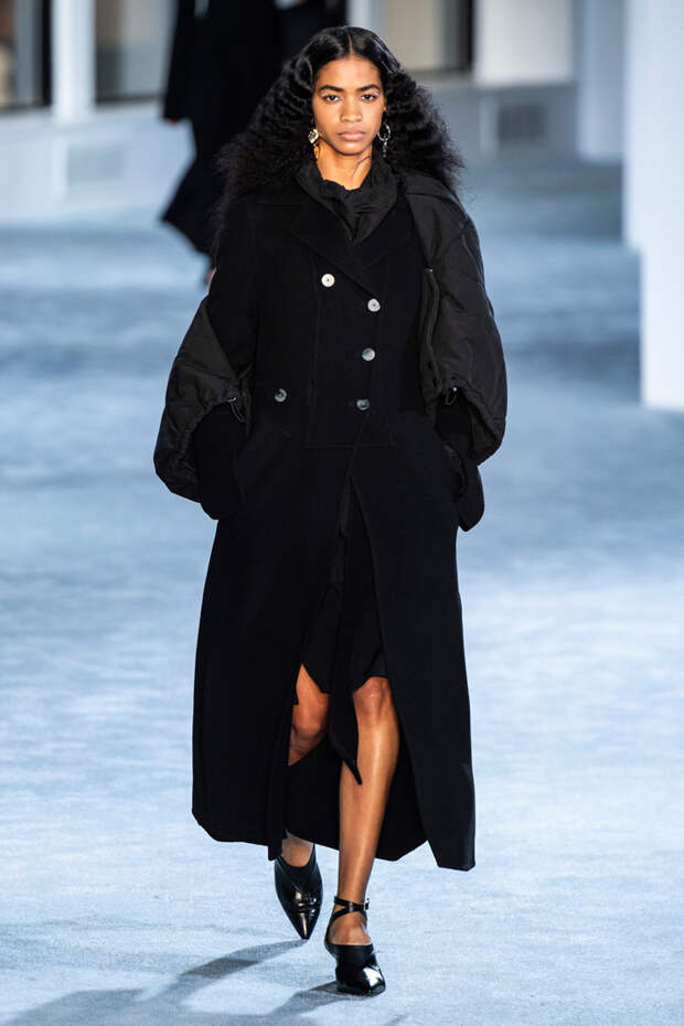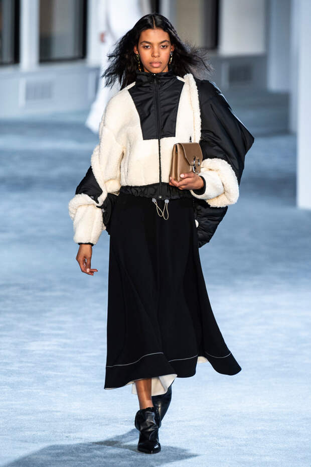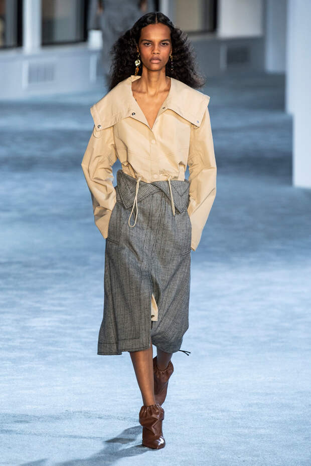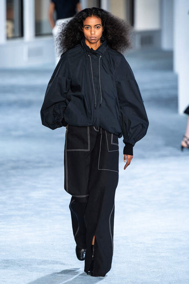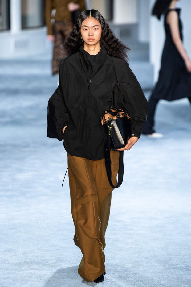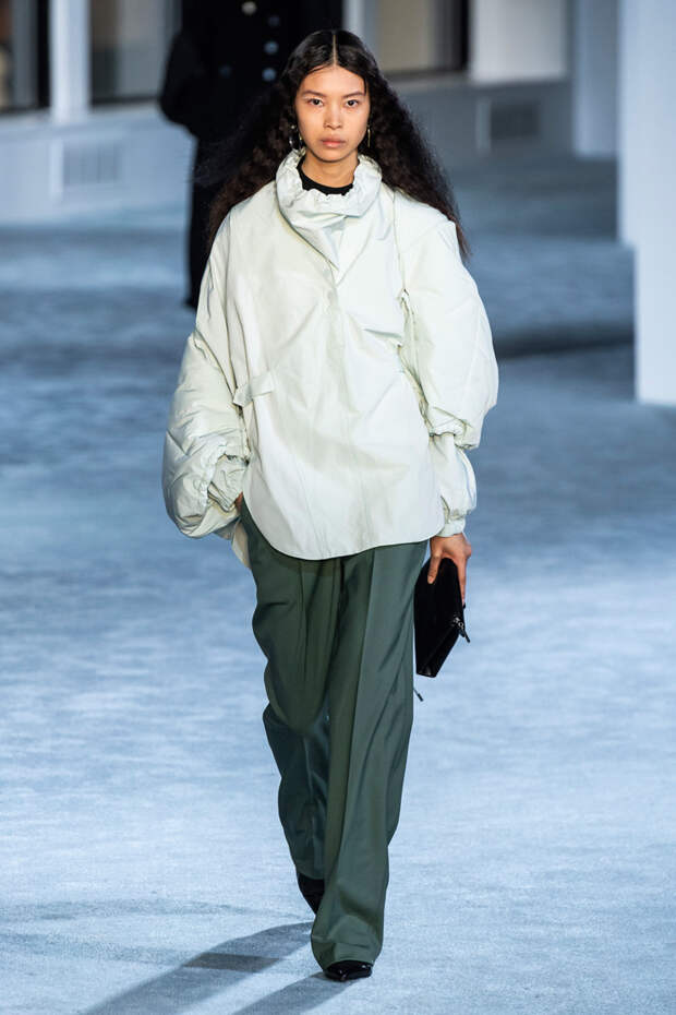 Под элегантными — ретро-пальто необычного кроя, которые носили еще в 50-х, изящные брюки со statement-топами, подчеркивающие фигуру платья. Иногда оба направления сливались воедино и в одной вещи — например, в блузе с пышными оборками, которая оказывается на самом деле всего-то пухлой нейлоновой курткой.