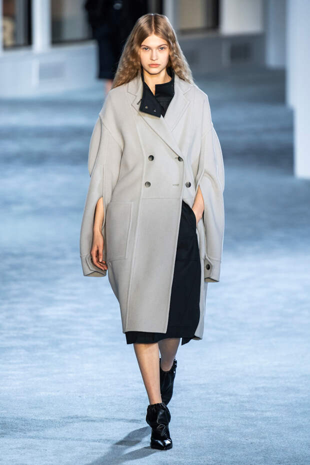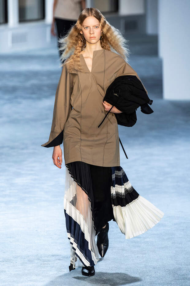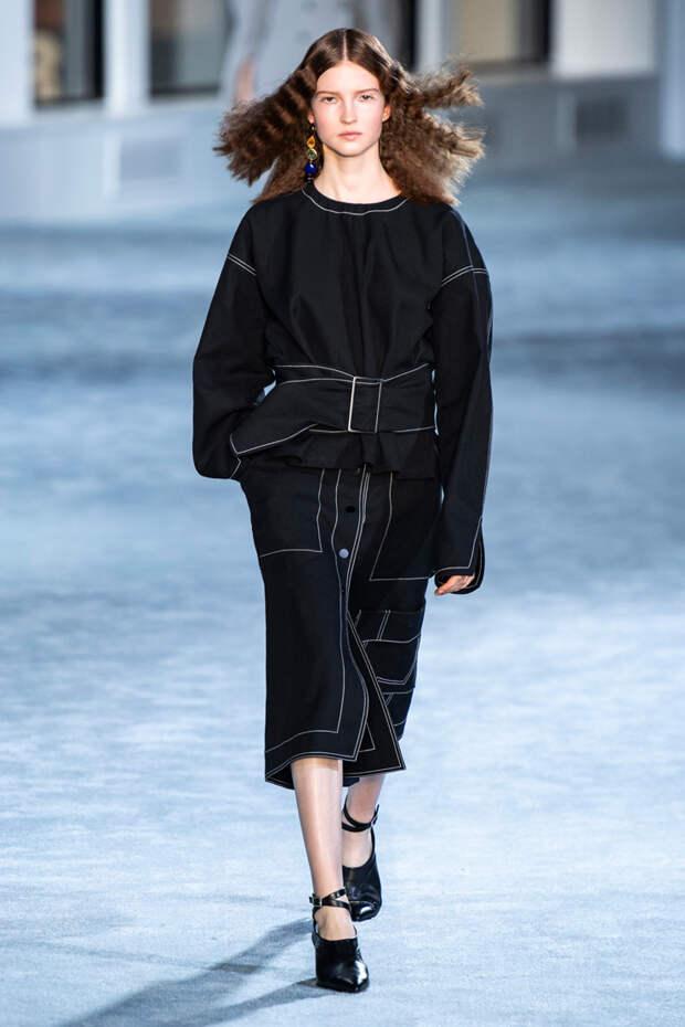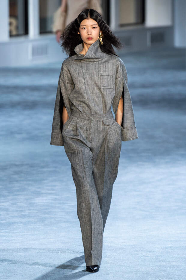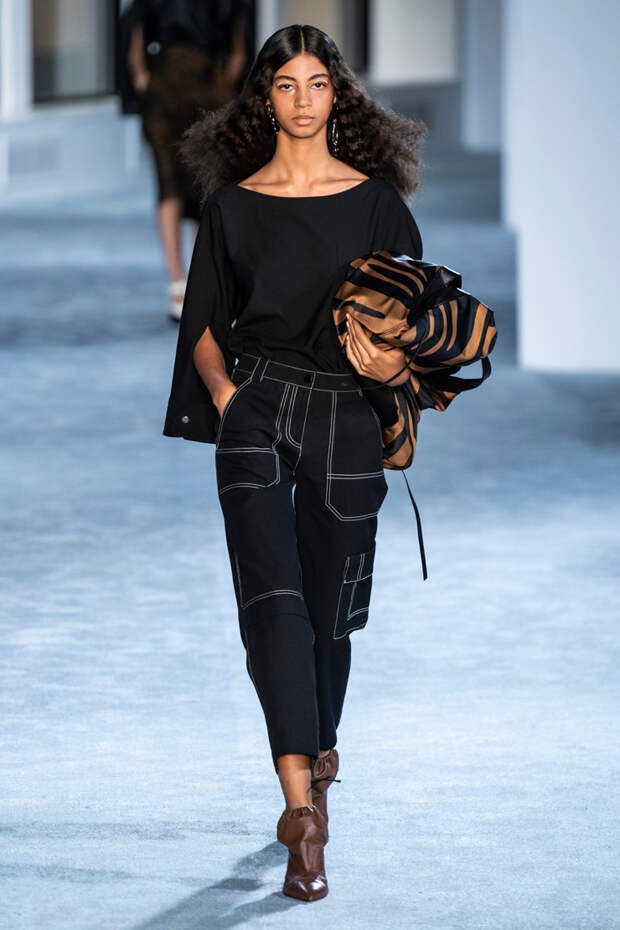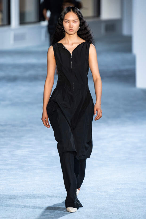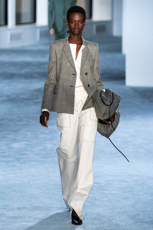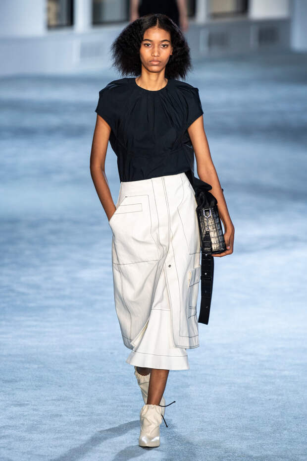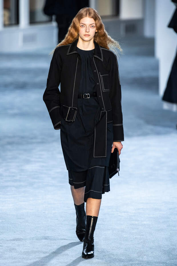 В первую очередь Филлип Лим избавился от всех «лишних» цветов, оставив только самые нейтральные краски: белый, серый, черный, коричневый, темно-синий и хаки. Их оказалось более чем достаточно — ярких цветов и пестрых принтов в Нью-Йорке было достаточно и без личного вклада Филипа Лима. Основной же идеей, вокруг которой построен весь предлагаемый им гардероб, стало сочетание рабочих вещей с традиционно элегантными, более женственными. Под рабочими имеются в виду и широкие джинсы с прострочкой по множественным карманам, и грубые юбки с запахом, напоминающие небрежно завязанные на талии куртки; и костюмы, похожие на униформенные комбинезоны, только из офисных тканей.