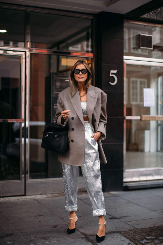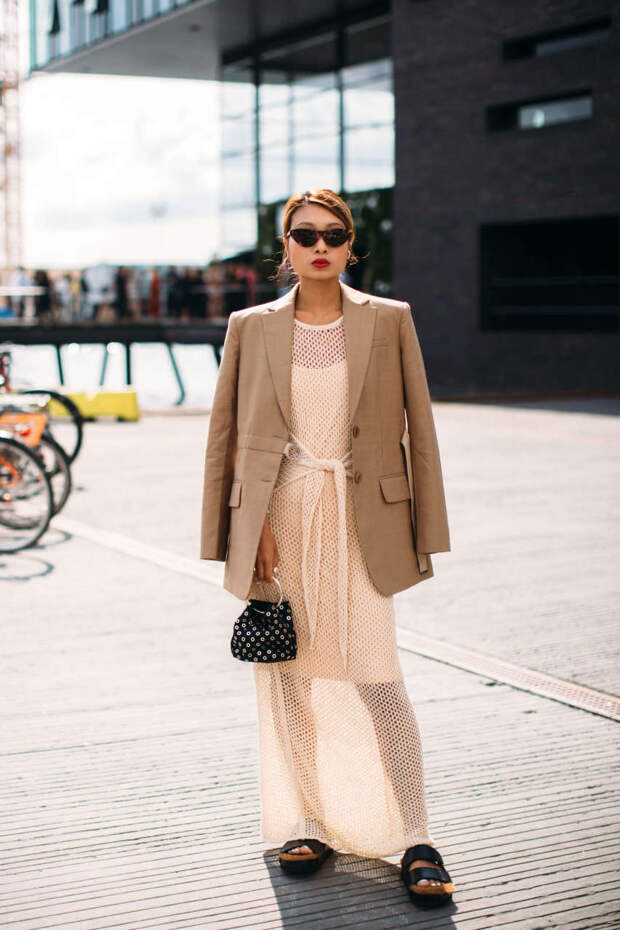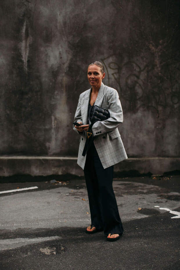 Твидовые модели немного отошли на задний план, сейчас в тренде строгие шерстяные и лаконичные льняные пиджаки. Популярная пара для подобных вещей — брюки мужского кроя. Пока погода позволяет, модницы дополняют их открытой обувью: вьетнамками, плетеными сандалиями или привычными «биркенштоками». Под пиджак фэшиониста надевают нейтральную футболку или кроп-топ. Рубашки не столь популярны: базовую «мужскую» модель теперь все чаще носят как самостоятельный верх. Ну а среди аксессуаров, традиционно дополняющих базовый пиджак-оверсайз, лидируют эффектные сумки кросс-боди и, конечно, яркие клатчи Bottega Veneta.