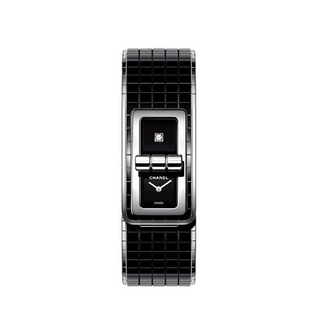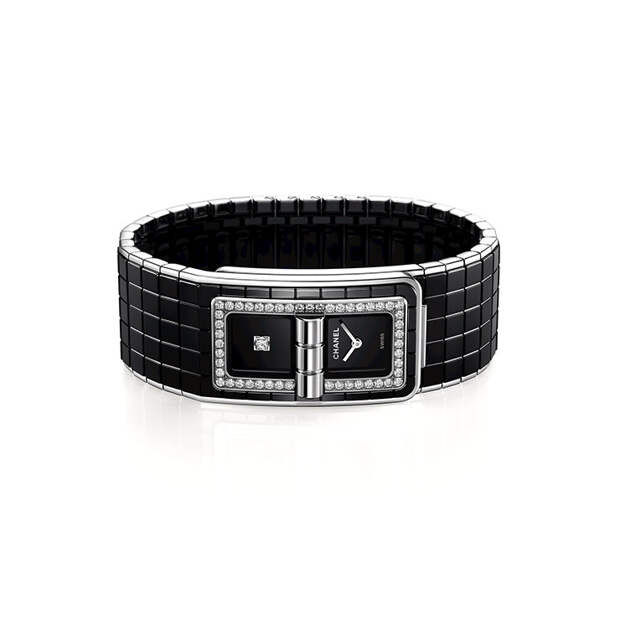 Code Coco. Steel and black ceramic case. Steel bezel set with 52 brilliant-cut diamonds. Black lacquered dials, one set with one princess-cut diamond. Steel and black ceramic bracelet. High precision quartz movement. Water resistance: 30 meters. Dimensions: 38.1 x 21.5 mm. Diamonds: ~0.63 ct.