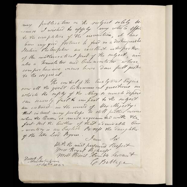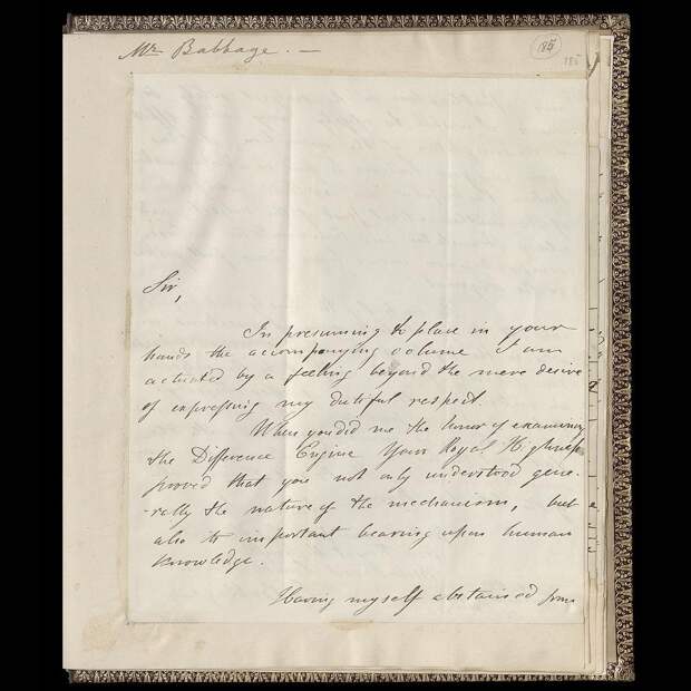 Автором послания был Чарльз Бэббидж, изобретатель первой аналитической вычислительной машины. Елизавета II уточнила в посте, что обнаружила данный документ в Королевском архиве.