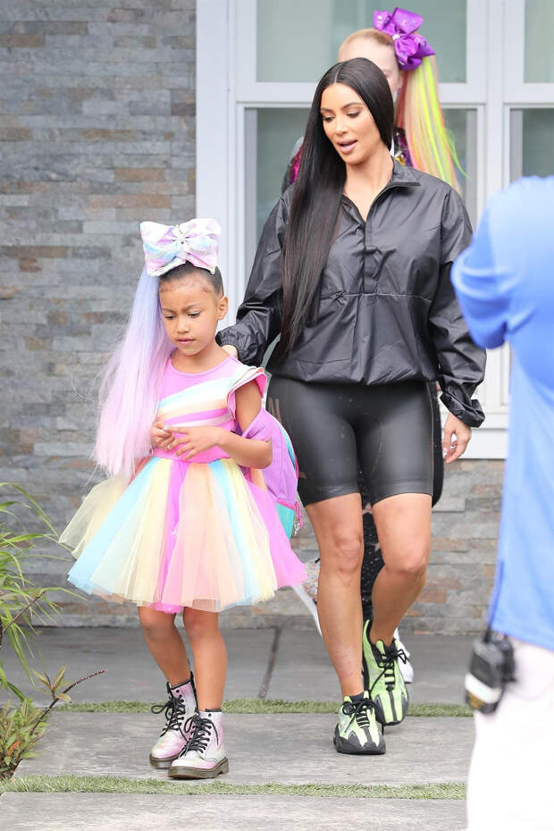 Вот и вчера дива отправилась на съемку видео с дочерью Норт в черных велосипедках и свободной ветровке, а финальным ярким аккордом стали кроссовки с вкраплениями ультрамодного зеленого неона — весь аутфит вышел авторства любимого супруга Канье Уэста и его детища Yeezy.
