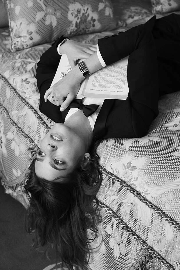 Разумеется, на каждой героине — ювелирная новинка Дома. Часы из черной керамики украшены стеганым мотивом Matelassé и застежкой, как у легендарной сумки 2.55. Циферблат создатели Code Coco спрятали внутрь браслета, края которого отсылают к твидовым жакетам Chanel благодаря «простроченным» белым кантом краям.