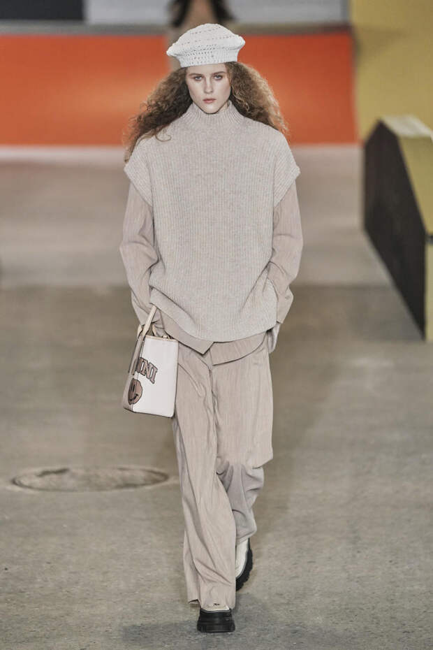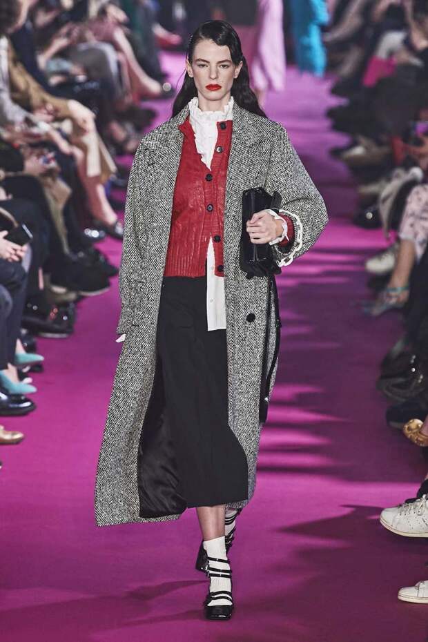 На ней большой пиджак, словно с чужого плеча, белая рубашка, пестрая жилетка и обычные джинсы — так получается что-то среднее между 70-ми и 90-ми.А вариант в стиле 40-х можно подсмотреть у MSGM и Prada. И он, пожалуй, подойдет для самой холодной погоды. Вместо школьной юбочки предлагается носить длинную, силуэта “карандаш”, а вместо пиджака поверх надевать уже пальто — в идеале фактурное. Поверх свободных платьев носить жилеты тоже можно — выглядят такие образы, как на шоу Cecile Bahnsen, очень уютно.