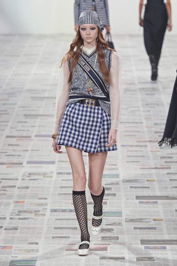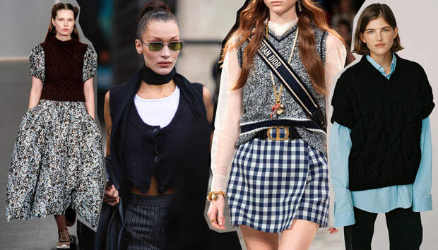 Большая часть образов с жилетами в главных ролях строится, конечно, на стиле преппи. Том самом, воспевающем эстетику дорогих университетов и закрытых школ. Не обязательно полностью копировать лук девушки из Лиги плюща — да и не всем такая лощеность нравится. Просто держите в голове саму комбо-основу: рубашка, жилет, брюки или юбка. Школьными, строгими и официальными всем этим предметам быть вовсе не обязательно. На показе Dior, например, вместо рубашки была прозрачная блуза. Юбка тоже была не под шотландку, а в клетку гингем — так выглядит гораздо свежее. Gucci тоже большой (это тот случай, когда его и впрямь можно назвать бабушкиным) жилет надевает поверх блузки — с размашистым жабо и оборками. У обеих марок к образам предлагаются высокие гольфы — но это уже скорее подиумная история, в жизни под первоклассницу маскироваться не обязательно.