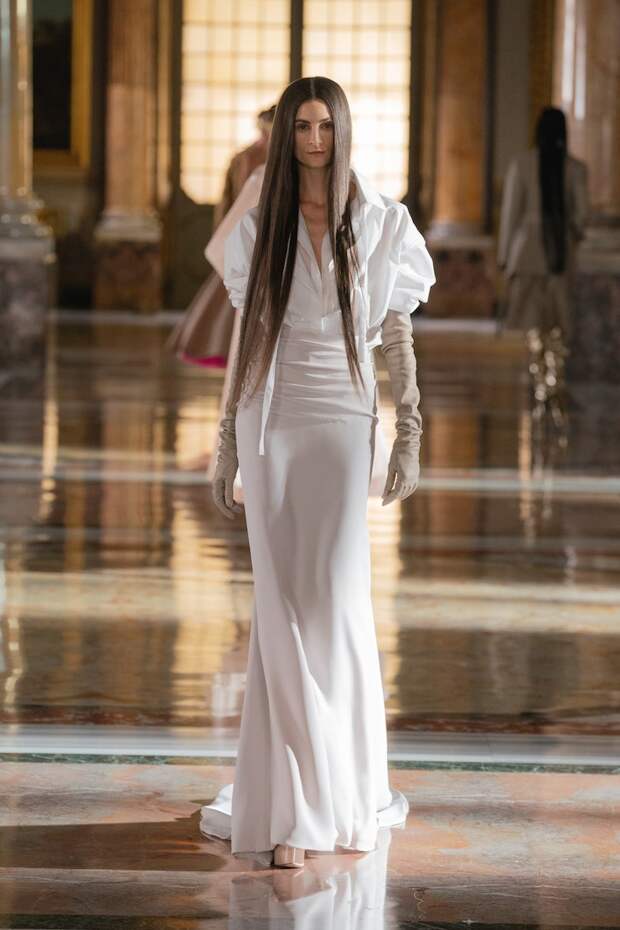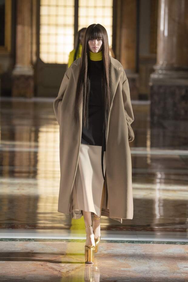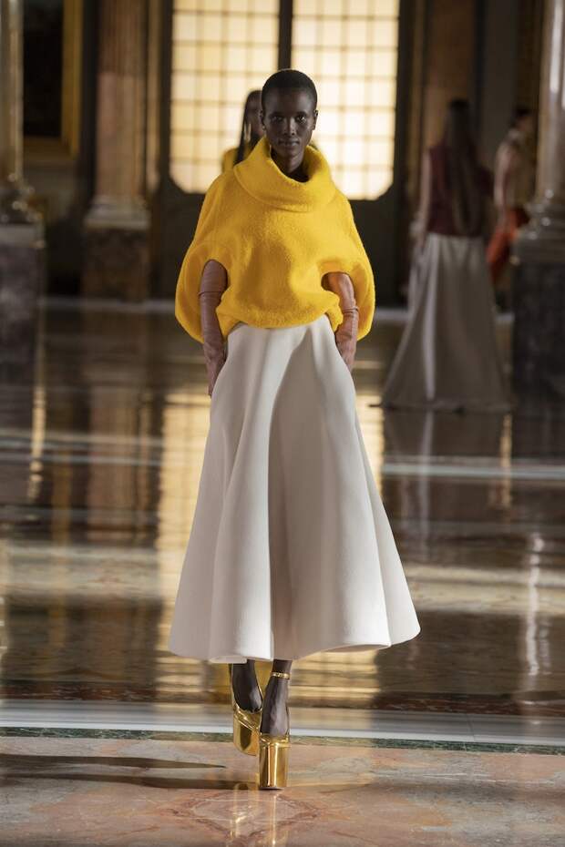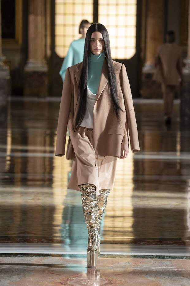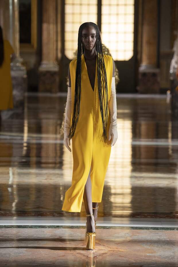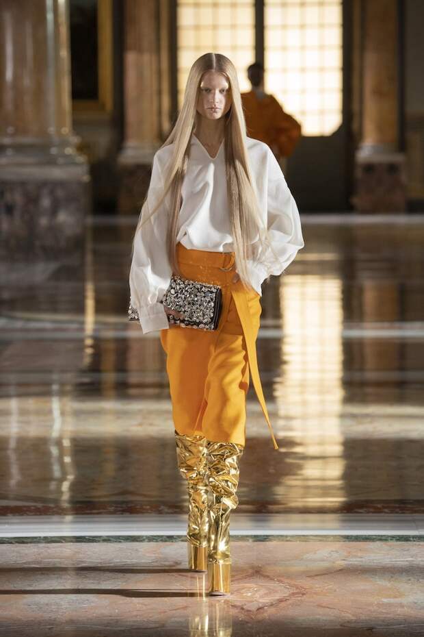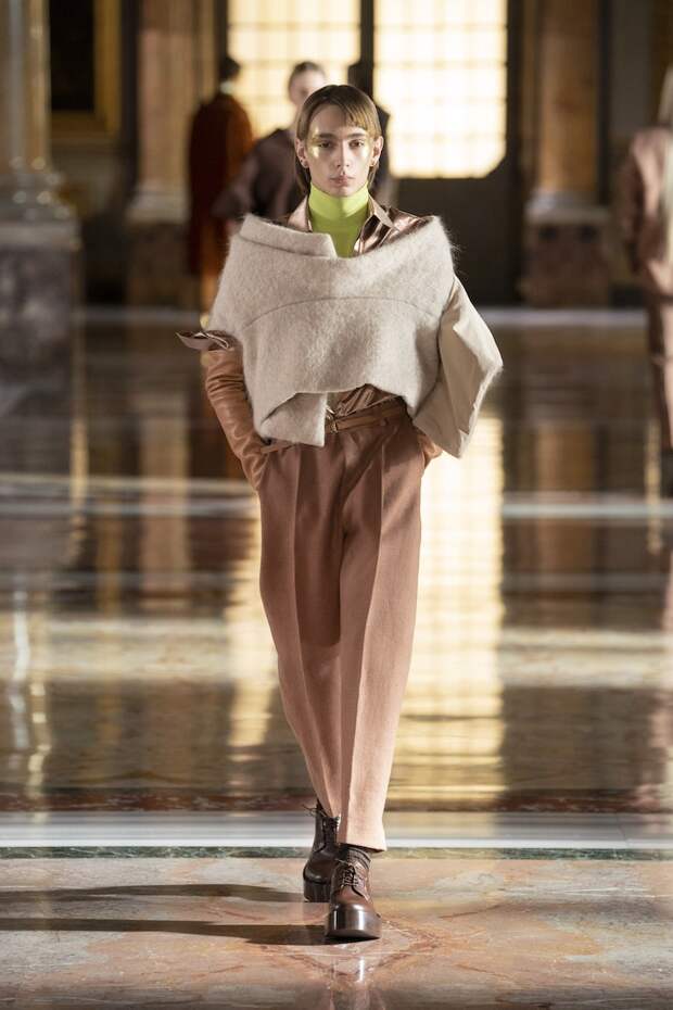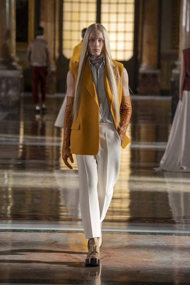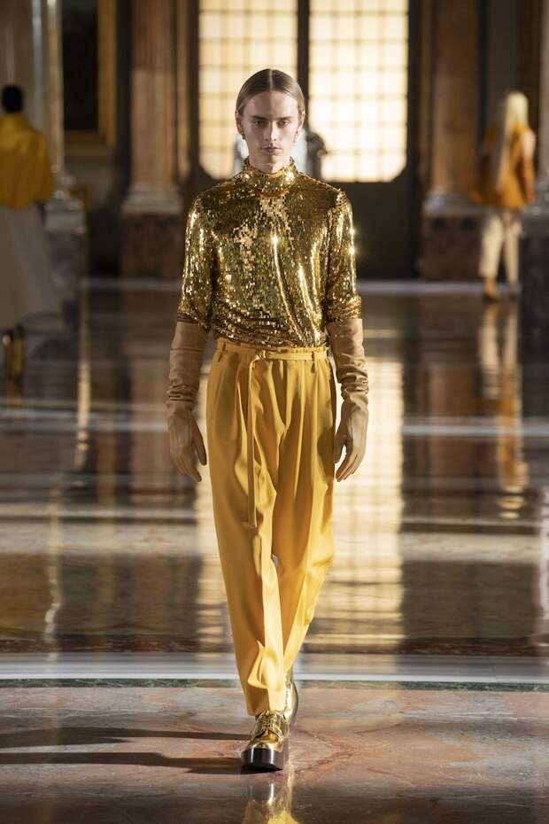 Лица многих украшали золотые маски из глиттера, отдаленно напоминающие сокровища древнеегипетских гробниц. Сочетания цветов тоже были абсолютно неземными: пудра с фуксией, мята с золотом, лаванда с бежевым и неоновым оранжевым, а дымчато-серый — с красным и бургунди. Абсолютно непредсказуемые цветовые комбо, которые никак не стереть из памяти и довольно сложно себе представить. И при этом — просто удивительно красивые. Вообще чувству цвета Пьерпаоло Пиччоли можно только позавидовать: он входит в тот узкий круг дизайнеров, которым дано смешивать краски, как никому. Лейтмотивом коллекции стало золото — но не буржуазно-респектабельное или отчаянно китчевое, как мы привыкли, а спокойное, практически медитативное — как на фресках византийских базилик. И таким же было общее ощущение происходящего на подиуме. Даже неоновые оттенки зеленого, оранжевого и фуксии в общем контексте не выглядели кричащими — они удивительным образом вписывались в эту парадоксально гармоничную картину. К слову, еще одно заметное новшество показа — впервые в кутюрную коллекцию были включены еще и мужские луки. Впрочем, мужские довольно условно: многие из них, по сути, не имеют привязки к гендеру и легко могли быть надеты и на девушек. И в этом тоже есть что-то инопланетное. Вы же не думаете, что у пришельцев есть пол и гендер в нашем привычном понимании?