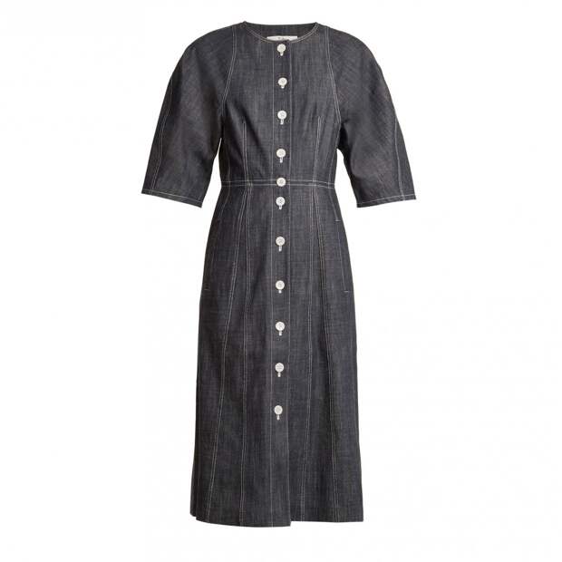 Если с лета остается летящее платье из денима, его можно адаптировать и под осенний гардероб. Под модели без рукавов, например, надеть футболку или водолазку. К расклешенным вариантам любой длины подойдут высокие сапоги (пример можно найти в последне коллекции Vanessa Seward) и пальто прямого фасона или с запахом.