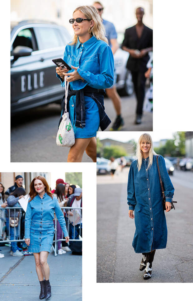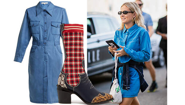 К голубому или темно-синему платью из денима можно выбрать любую яркую обувь и верхнюю одежду. Актуальнее всего будут смотреться казаки или ковбойские сапоги, какие предлагают носить этой осенью Calvin Klein. К высоким сапогам можно подобрать плотные яркие гольфы, которые будут немного выглядывать из-под голенища. Если хотите экстравагантный образ, просто наденьте шубу из яркого меха. Но классические коричневые модели тоже подойдут, если выбрать обувь темного цвета.