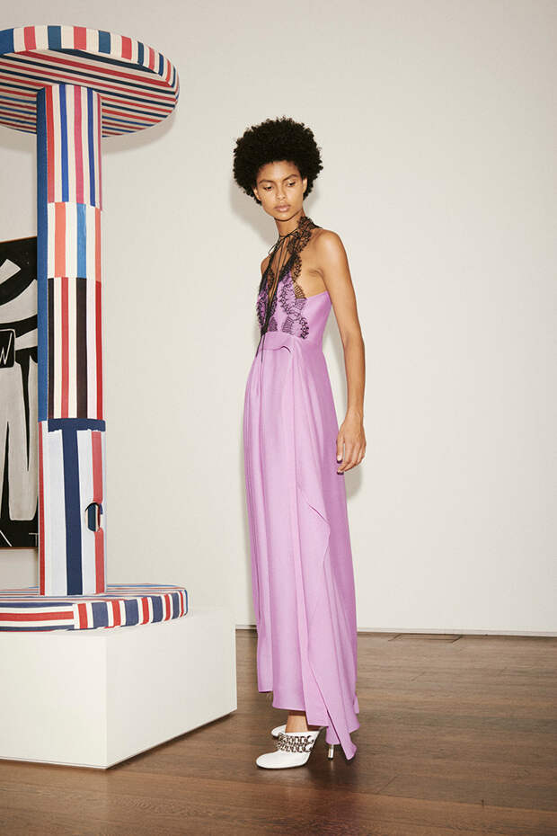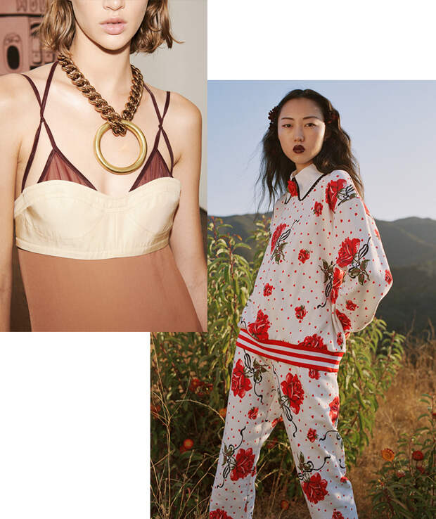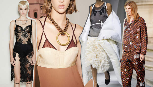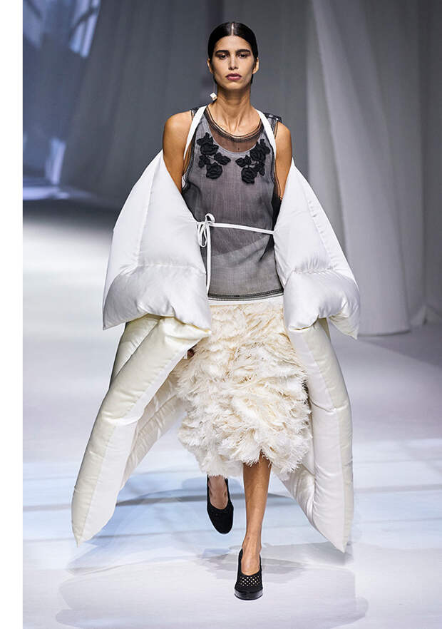 Так что у Fendi в коллекции встречаются вариации на тему знаменитого онлайн-челленджа времен карантина, когда все делали платья из подушек. А еще — платья-халаты и многочисленные объемные стеганые вещи, словно сшитые из теплых одеял. Виктория Бекхэм и Джорджо Армани активно шьют комбинации, Батшева Хей — очевидно домашние платья, сливающиеся с узорами мебельной обивки, сестры Родарте — пижамы и сорочки.