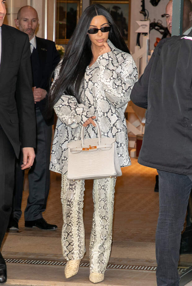 Монохромные наряды - один из главных трендов нового сезона, и Ким Кардашьян уже активно его осваивает. Вот только вместо привычного способа реалити-дива предпочитает иной: она сочетает вещи с одним и тем же принтом вместо того, чтобы выбирать однотонные модели. Так, 25 марта папарацци застали бизнесвуман в Париже в "змеином" total look: прямые брюки, остроносые сапоги и плащ-рубашка были с одинаковым анималистичным принтом.