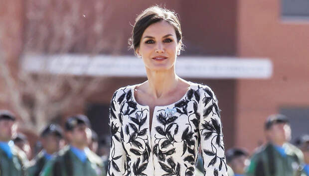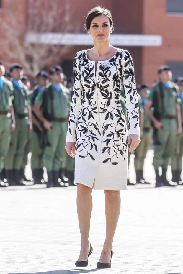 И вчера супруга Филиппа VI приняла участие в военном параде в молочно-белом платье с вышивкой в форме листьев — авторства Варелы, к нему она добавила туфли Carolina Herrera и украшения Chanel. К слову, в этом же платье королева уже появлялась на публике в 2016 году, и ее не остановил скандал, связанный с именем испанского дизайнера: его обвинили в плагиате и копировании одного из образов Oscar de la Renta. Судя по всему, Летиция уверена в честной репутации испанца и поддерживает его своими выходами.