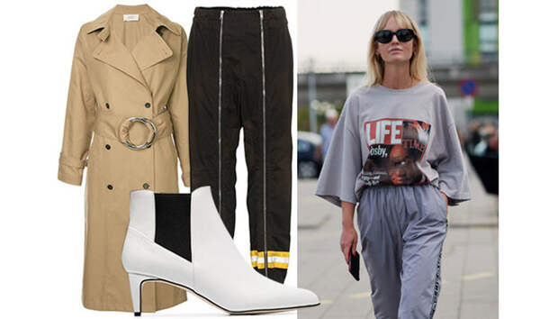 Конечно, треники не могут не сочетаться с кроссовками, но если вам не хочется ударяться в спортивный стиль, в качестве верха выберите классический тренч песочного цвета.