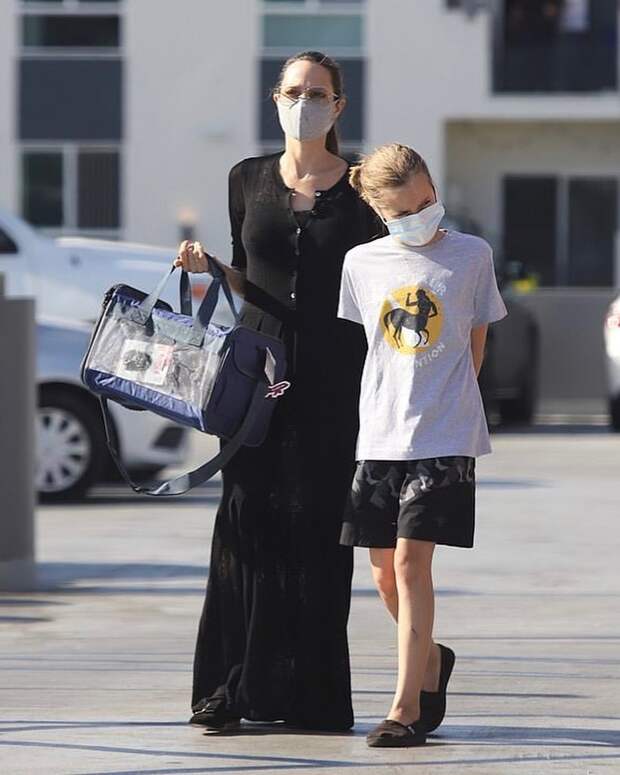 В Калифорнии все еще необходимо носить маски - и Джоли с дочерью не стали пренебрегать этим правилом. Актриса собрала волосы в низкий конский хвост и дополнила аутфит очками-авиаторами.