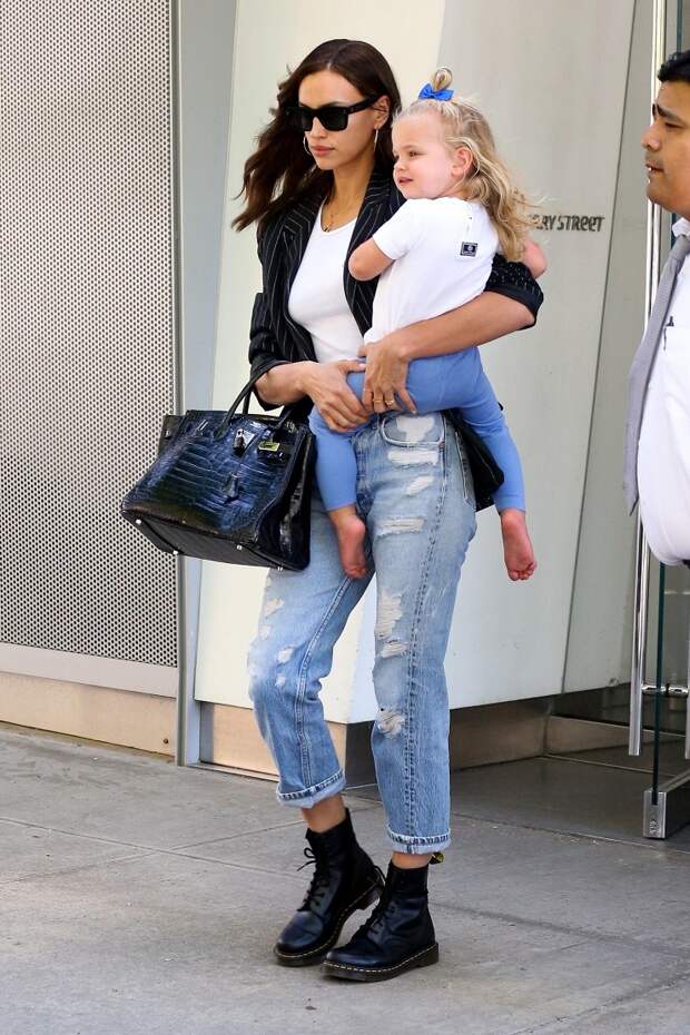 В первый день июля Ирина Шейк отправилась на прогулку с малышкой Леей по Нью-Йорку. Для семейного променада топ-модель выбрала базовый образ - классическую белую футболку, черный блейзер и прямые джинсы из светлого денима с потертостями. А главными акцентами стали любимые ботинки молодой мамы, грубые Dr.