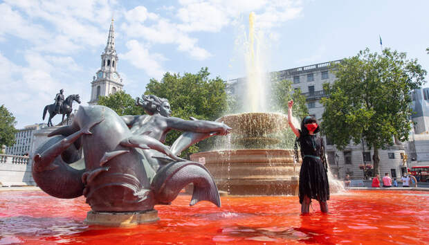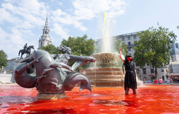 Активисты из организации Extinction Rebellion провели акцию протеста в центре Лондона в Международный день коренных народов мира. Они выкрасили воду в фонтанах на Трафальгарской площади в зеленый и красный — цвета олицетворяют экоцид и геноцид, с которыми вынуждены бороться коренные народы Бразилии.