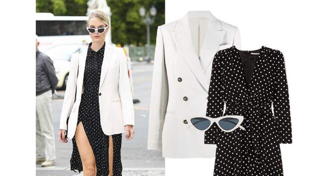 Платье ALESSANDRA RICH, 86 948 руб.; блейзер BRUNELLO CUCINELLI, 288 500 руб.; очки LE SPECS, 8 511 руб.; кроссовки STELLA MCCARTNEY, 29 464 руб.