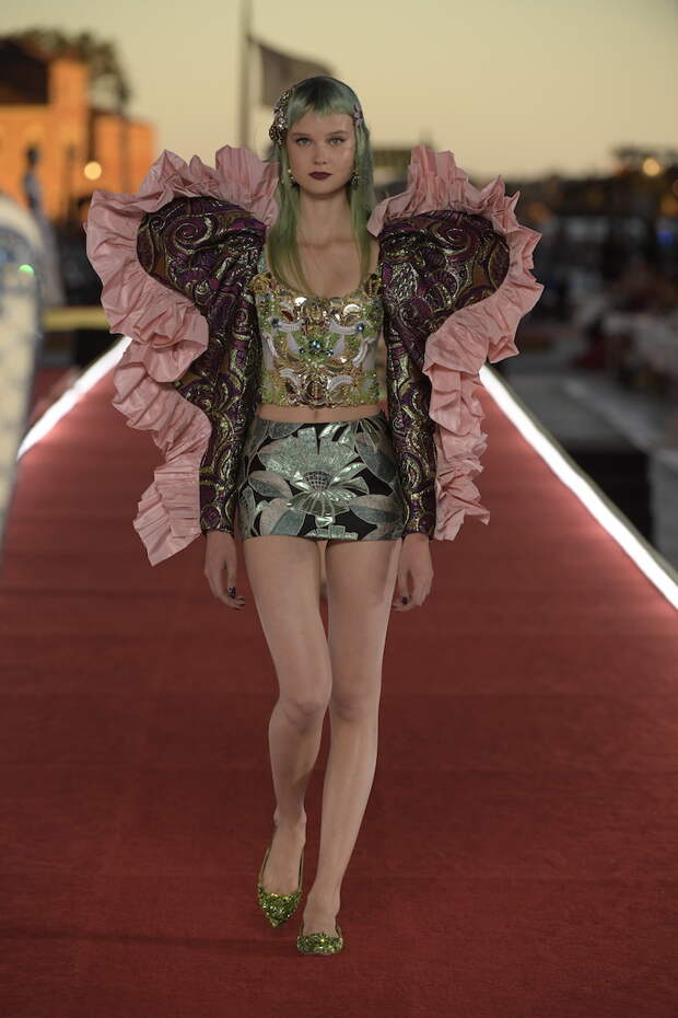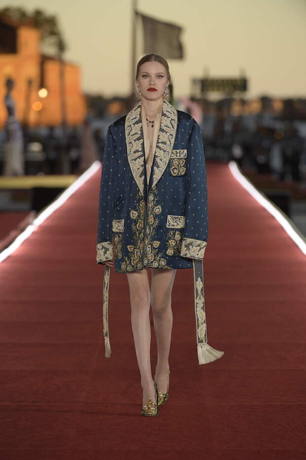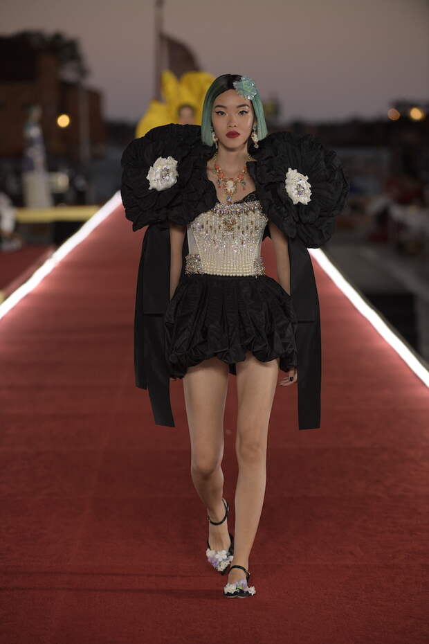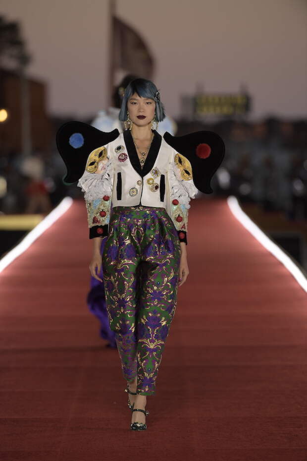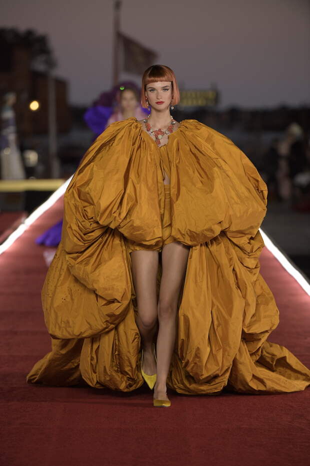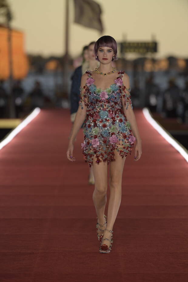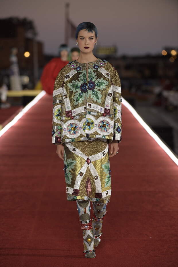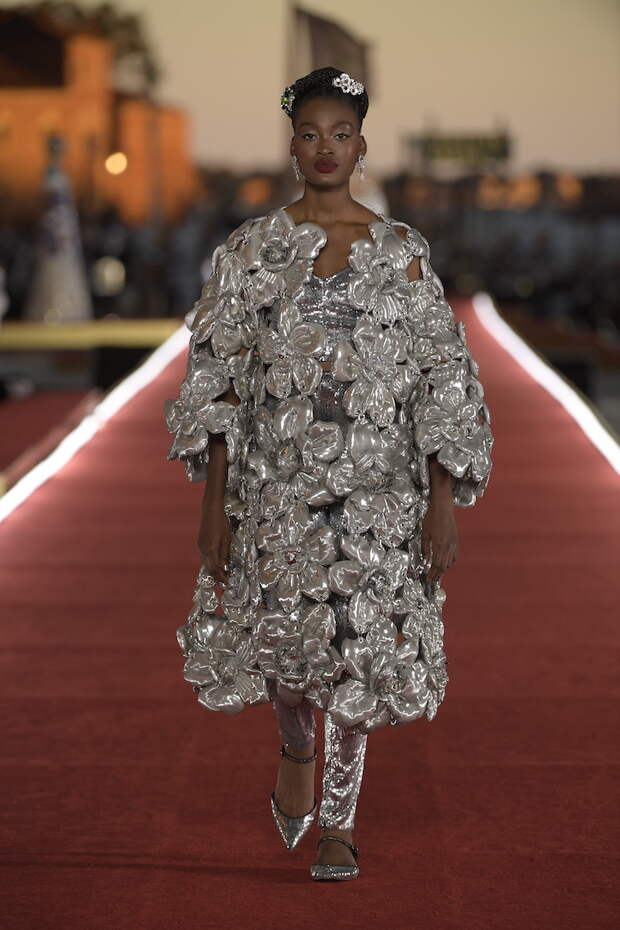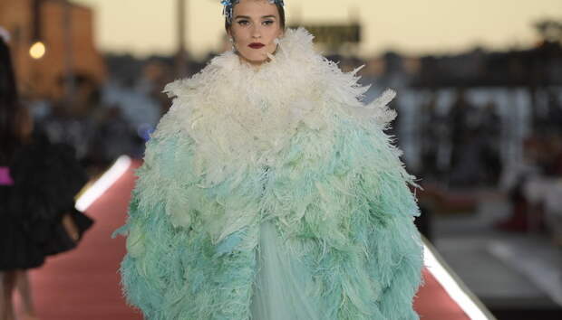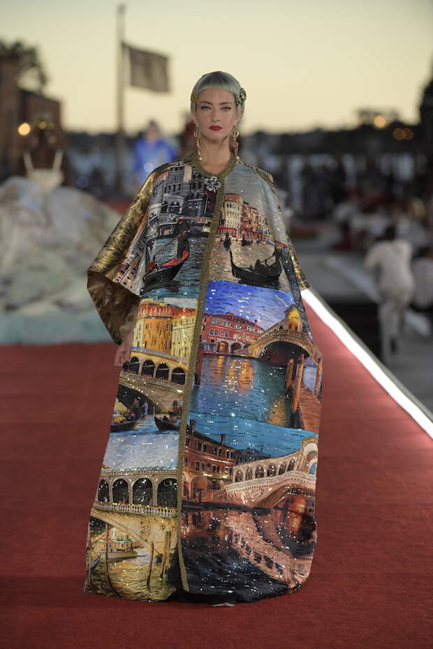 В Венеции состоялось, пожалуй, самое зрелищное шоу сезона: кутюрный показ Dolce & Gabbana Alta Moda. Он получился настоящим признанием в любви городу на воде. Жакеты, роскошные бальные платья и драматичные кейпы украшали вышивки с каналами и гондолами, карнавальными масками, львами и даже шляпами-треуголками — негласными символами Венеции.