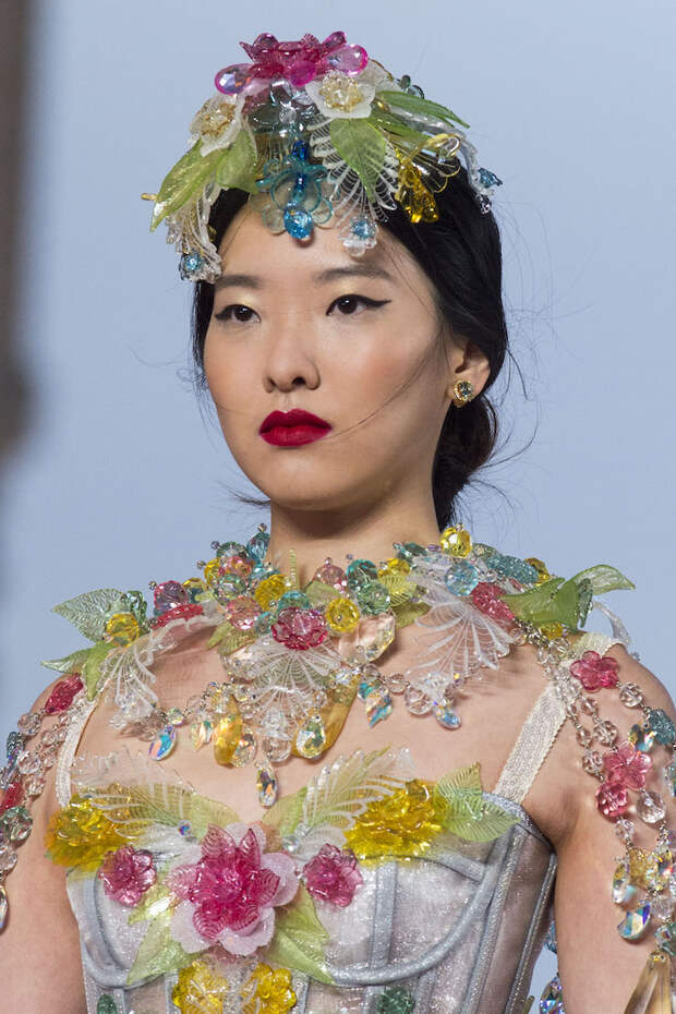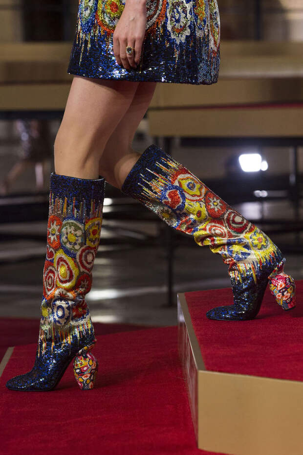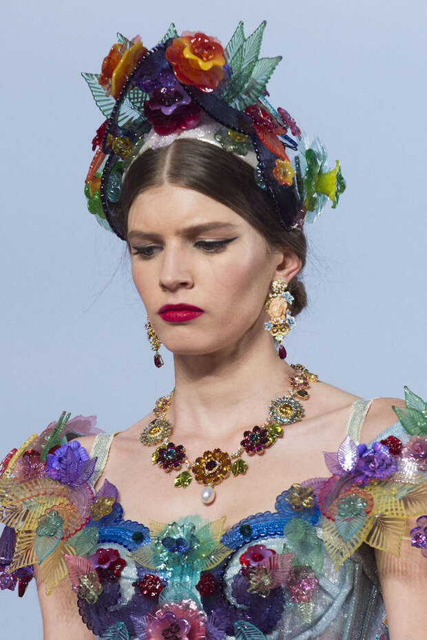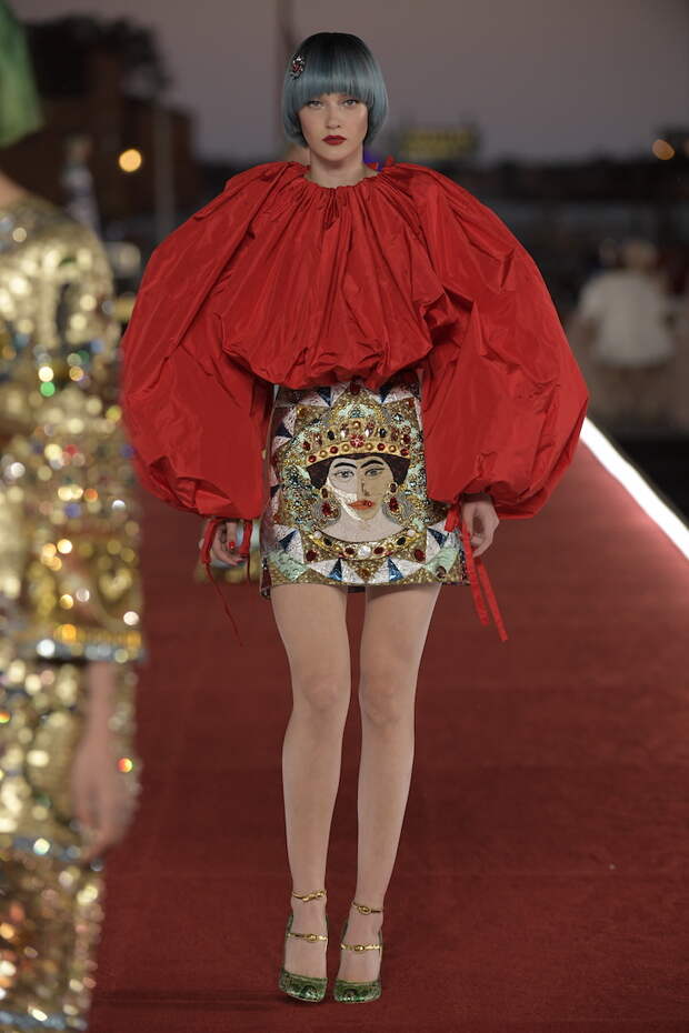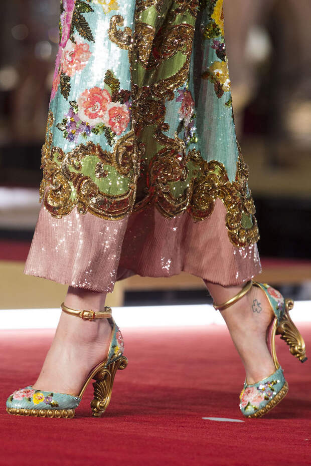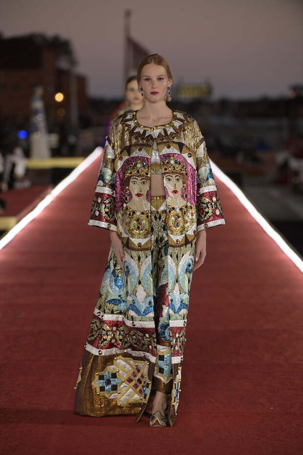 Отдельное место в коллекции занимали платья и юбки с вышивками, повторяющими сюжеты византийских храмовых мозаик — постоянный мотив в коллекциях итальянского дуэта дизайнеров.