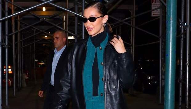 А поверх она надела кожаный жакет родом из той же эпохи, чтобы сделать наряд еще более трендовым. Белла дополнила этот лук маленькой сумочкой-хобо, ботильонами на шпильке и своими неизменными овальными очками в стиле ретро.