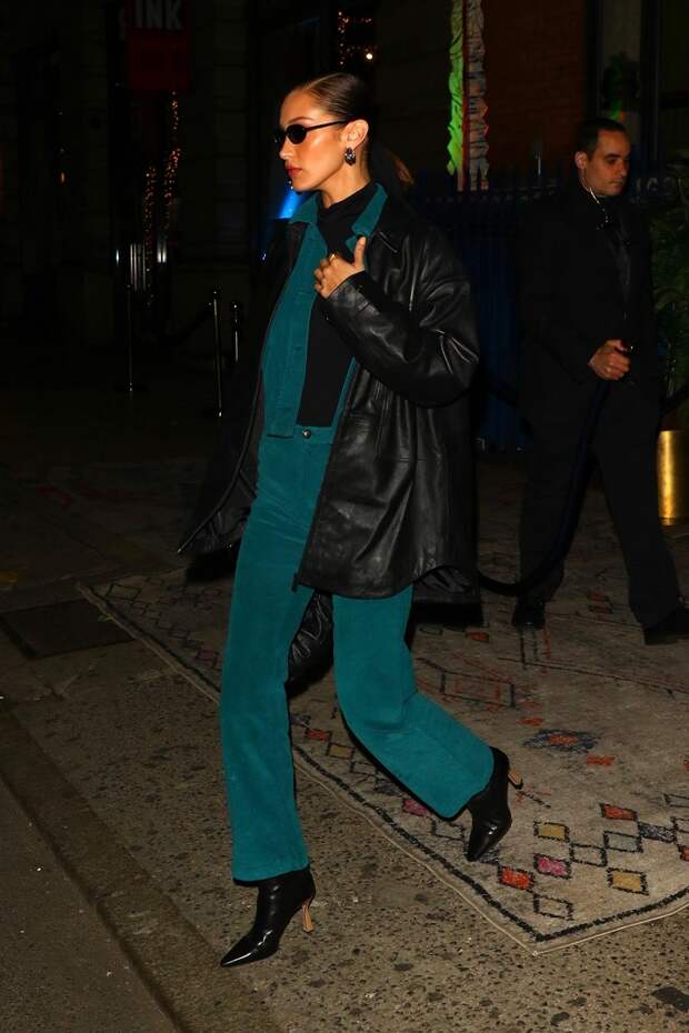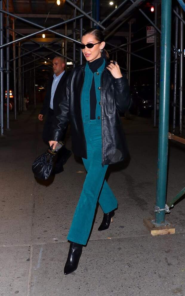 Белла Хадид делает ставку на лейеринг в промозглые февральские дни. Чтобы позволить себе забыть о громоздкой верхней одежде, она одевается многослойно, выбирая теплые плотные натуральные материалы. Супермодель создала образ в духе эстетики 90-х, сочетая строгий утилитарный костюм-двойку из бирюзового вельвета с надетой под низ кашемировой водолазкой.