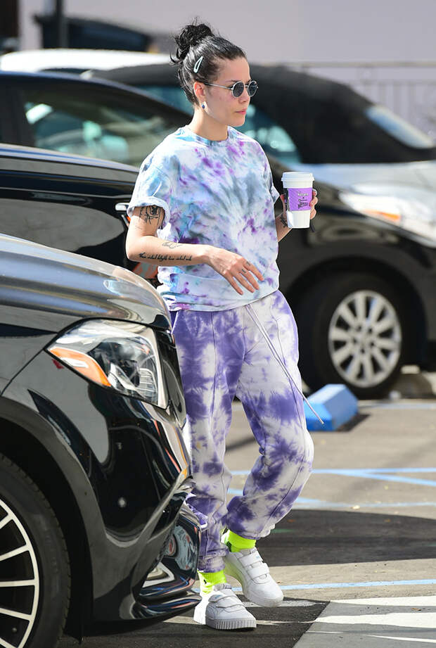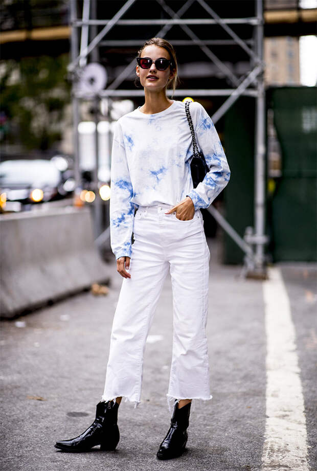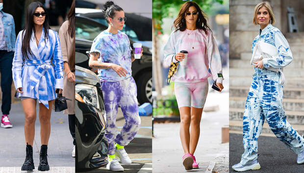 Самый очевидный (но от того не менее действенный!) способ – миксовать принтованные вещи с однотонными и лаконичными. Фэшиониста демонстрируют: даже самый простой образ заиграет новыми красками, если накинуть поверх базового пальто свитер в стиле тай-дай. Действительно, сделать хаотичный узор главным героем образа – самая лучшая идея. Посмотрите, как это делают модницы: носят тай-дай трикотажные платья в гордом одиночестве (если быть точнее – с самыми базовыми белыми кроссовками) или приправляют монотонные черные образы яркой тай-дай рубашкой. Первое, с чем ассоциируются размытые узоры, – расслабленный спортивный стиль. Это, пожалуй, самый простой способ сочетания тай-дая – для тех, кто не хочет заморачиваться. В таком случае смело надевайте тай-дай футболку с одноцветным спортивным костюмом и ботинками на шнуровке. Если хочется блистать, безусловно, есть более интересные варианты. Тай-дай точно не останется без внимания, будь он в дуэте со строгим брючным костюмом, высокими казаками и широкими бермудами. Причем расположение принта совершенно неважно – на миниатюрной сумочке, сапогах или рубашке – выбирать только вам.