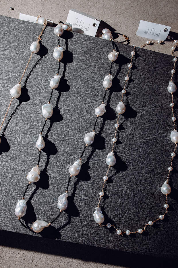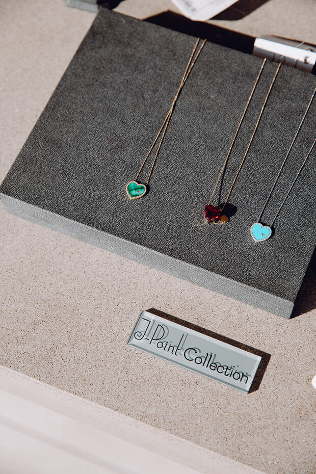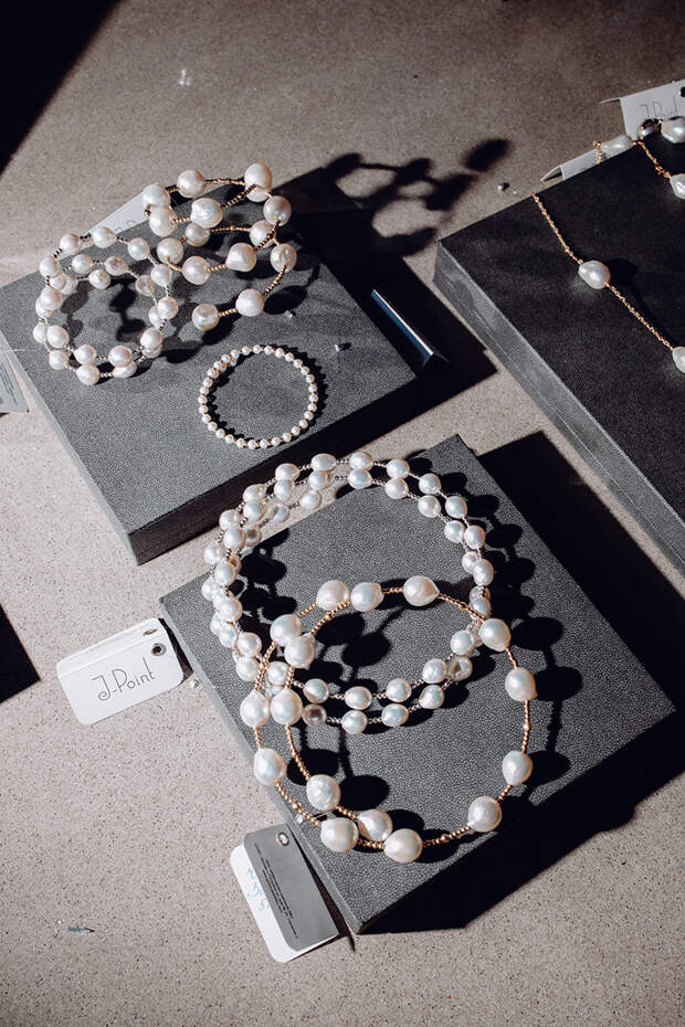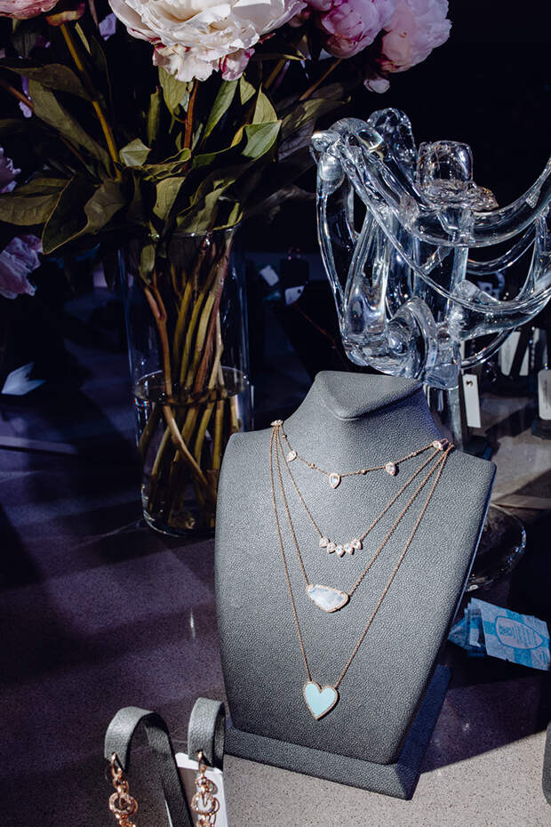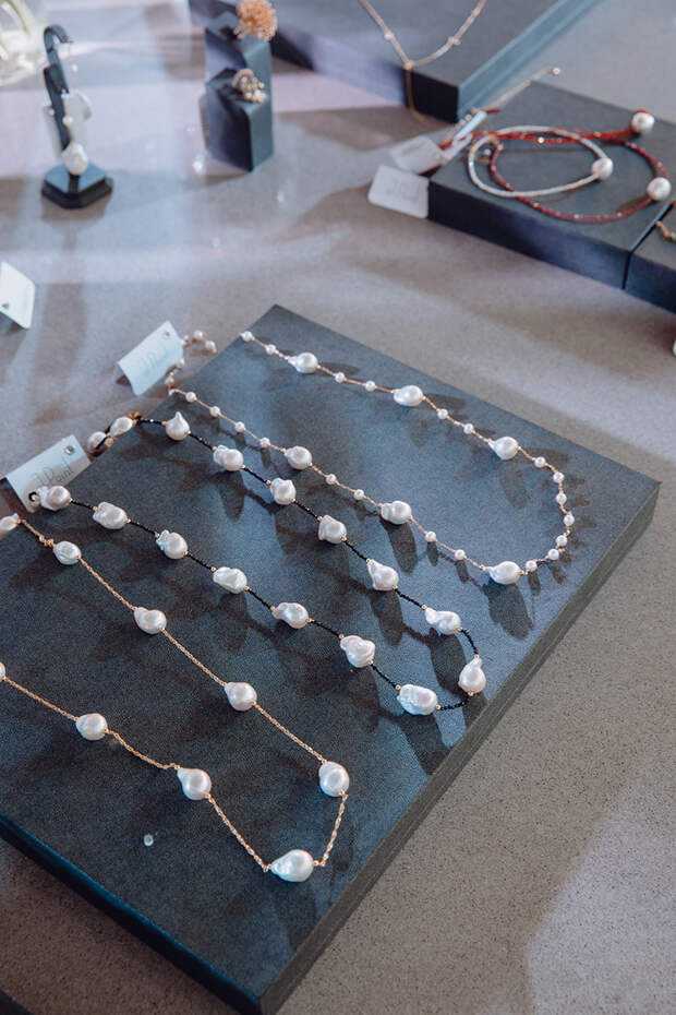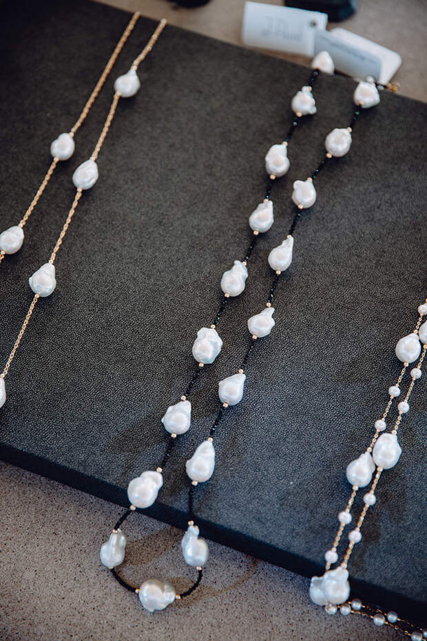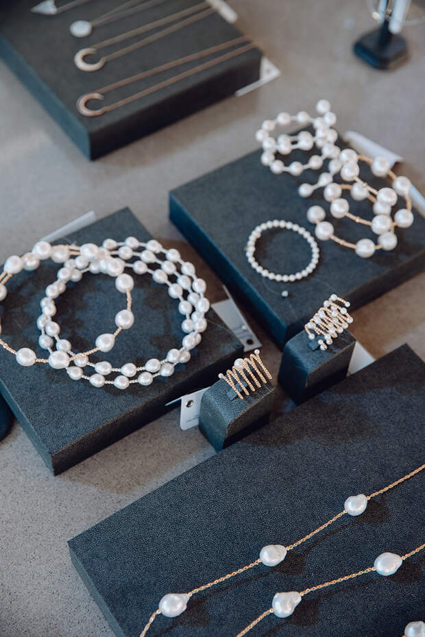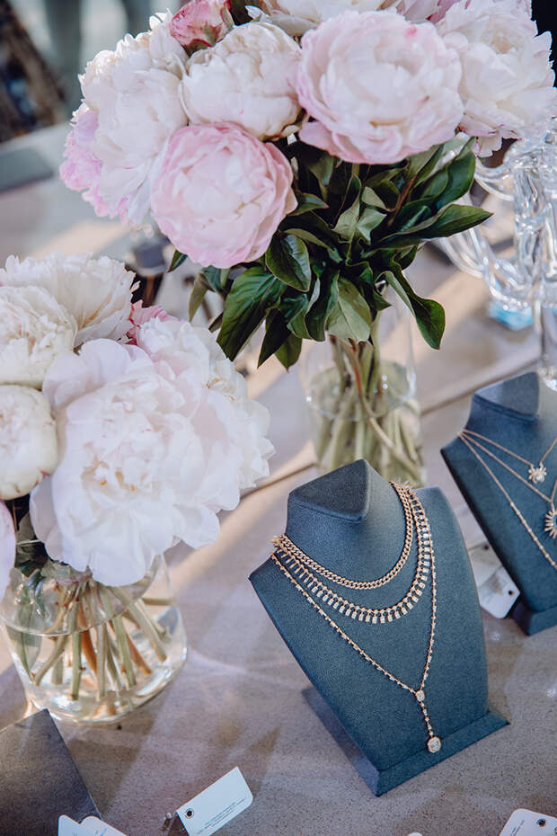 Гостьи первыми смогли примерить золотые украшения с бриллиантами и жемчугом из новой летней коллекции.