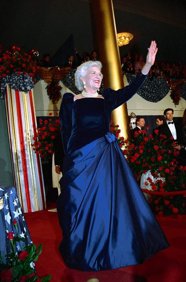 Барбара приняла эстафету первой леди сразу после Нэнси Рейган, а это было сложным испытанием для имиджа: все-таки, та была одной из самых стильных женщин в истории Белого дома. На помощь Барбаре пришел канадский дизайнер Арнолд Скази (он также сотрудничал с Мейми Эйзенхауэр, Хиллари Клинтон и Лорой Буш). Для церемонии инаугурации Джорджа Буша старшего он предложил ей платье в лучших традициях 1980-х очень красивого цвета ночного неба с бархатным топом и сатиновой юбкой.
