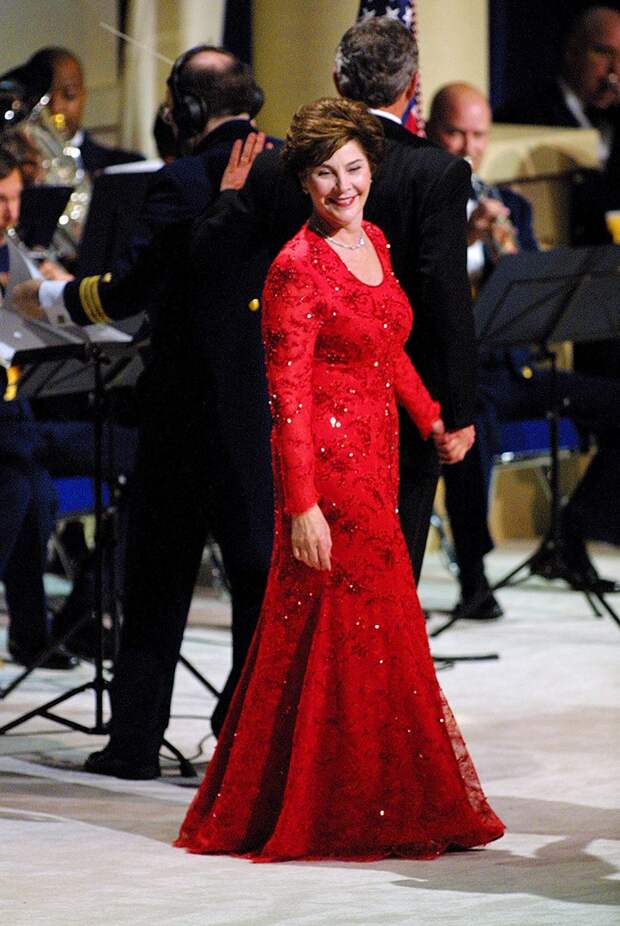 На церемонии в честь своего мужа, Джорджа Буша-младшего, Лора появилась в роскошном платье рубинового оттенка, расшитом кристаллами. Автором платья стал малоизвестный дизайнер из Техаса Майкл Фэарклот. Выбор не был удивительным – до выбора на президентский пост Буш являлся губернатором этого штата. Говорят, что Фэарклоту стоило больших усилий уговорить Лору надеть такое яркое платье: в обычной жизни вкусы первой леди были куда более скромными.