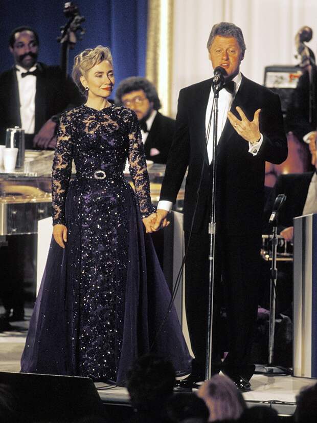 Вопреки впечатлению, которое могло создаться за последние месяцы, в гардеробе Хиллари Клинтон числятся отнюдь не только костюмы. Так, для первой церемонии инаугурации своего мужа 46-летняя Хиллари выбрала очень красивое платье глубокого фиолетового цвета из кружева и тончайшего шелка. За один из самых красивых нарядов в истории Белого дома отвечала дизайнер Сара Филлипс – собственный бренд девушка основала всего за четыре года до работы с первой леди.