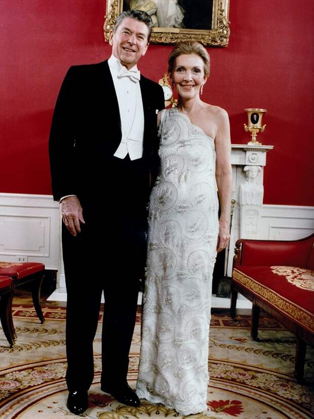 Американский дизайнер Джеймс Галанос, который ушел из жизни в октябре этого года, был близким другом Нэнси и фактически создавал для нее весь вечерний гардероб. Великолепное платье на одно плечо из шелка и кружева, блестящее во всех смыслах слова, – тоже его рук дело. Галанос провел бок о бок с четой Рейган все их годы в Белом доме, но ушел из модной индустрии вскоре после отставки Рональда.