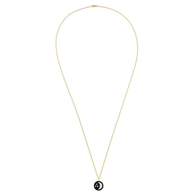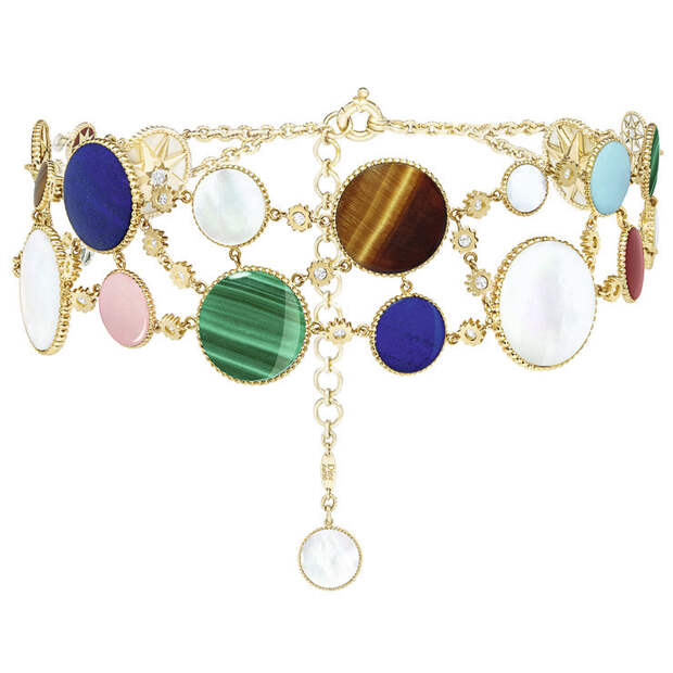 В одной версии ожерелья в золотой кант вписан символ Дома, вторая же посвящена красоте драгоценных и полудрагоценных камней: малахит, бирюза и сияющий белый перламутр создают яркий калейдоскоп, который хочется носить, как талисман, не снимая.