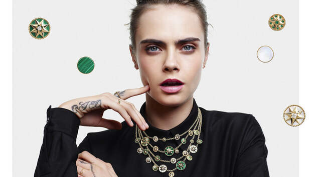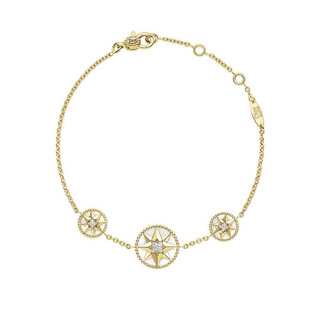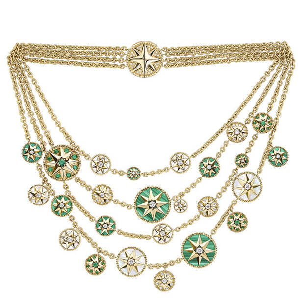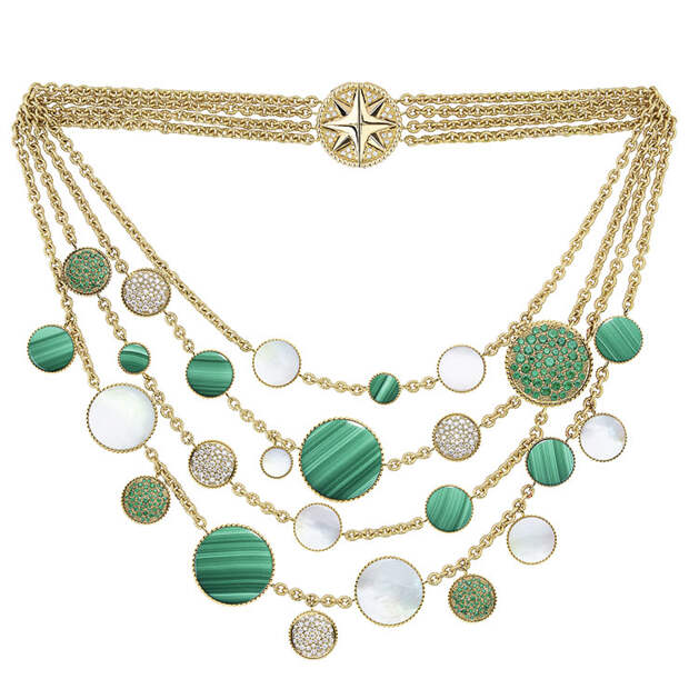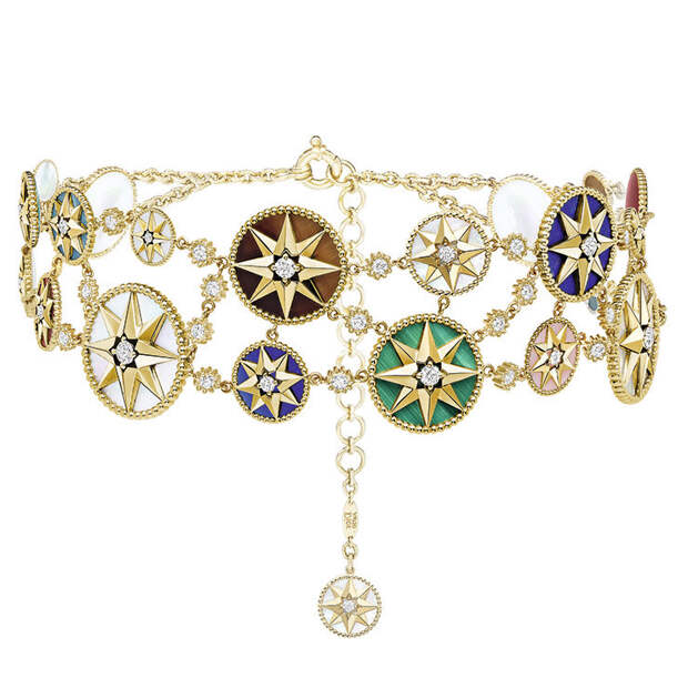 Ювелирная коллекция Rose des Vents, посвященная эмблеме французского Дома, каждый сезон раскрывается с новой стороны благодаря безграничной фантазии Виктуар де Кастеллан. В этот раз художественный директор Dior Joaillerie объединила две линейки украшений с розой ветров: Mimirose и Rose Céleste. Главными предметами коллекции стали два чокера из медальонов и золотых нитей с бриллиантами, подвешенными на них, будто капли.