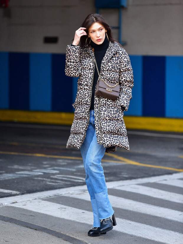 Если весна не спешит с теплом, а вы уже настроены на долгие прогулки на свежем воздухе, вас всегда выручит правильно подобранная верхняя одежда. К примеру, Белла Хадид выбрала для прогулки по Нью-Йорку тонкий удлиненный пуховик с леопардовым принтом. Модель предпочитает носить его нараспашку, сочетая с черным свитером-лапшой и прямыми джинсами с необработанным краем в насыщенном голубом оттенке.