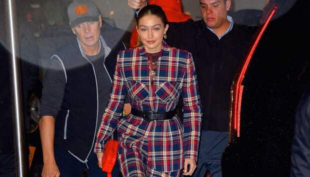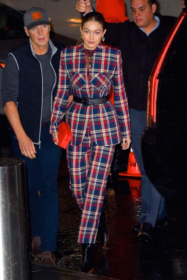 Джиджи Хадид вышла в свет в брючном костюме мечты. Благодаря провокационным деталям в духе 80-х - крою лифа по модели бюстье - этот наряд идеально подходит для вечера. Супермодель сделала его еще женственнее, подчеркнув талию контрастным ремнем. Шотландская клетка в духе панк - один из самых трендовых принтов этого сезона, на который стоит сделать акцент в противовес обычному однотонному костюму.